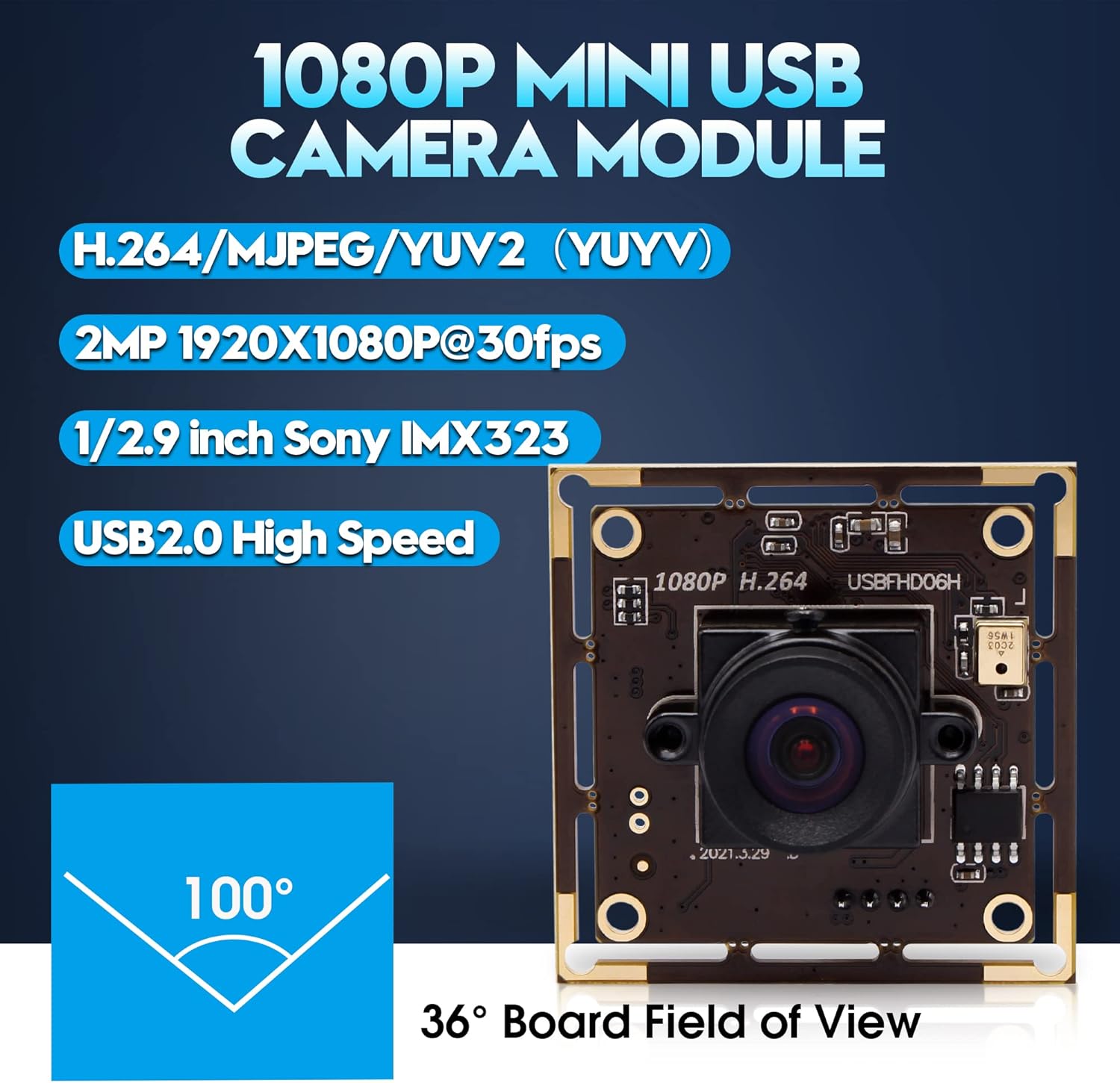 【100° No Distortion Lens&0.01lux Low Light 】This usb camera module with cmos imx323 image sensor, 0.01lux low light available to work under weak light conditions and catch sharp clear image and accurate color in dark places. 100° No Distortion Lensprovides a sharp image at fixed distances making it ideal for indoor usage, USB webcam produces exceptionally sharp and clear videos at resolutions up to 1920 x 1080 at 30fps.