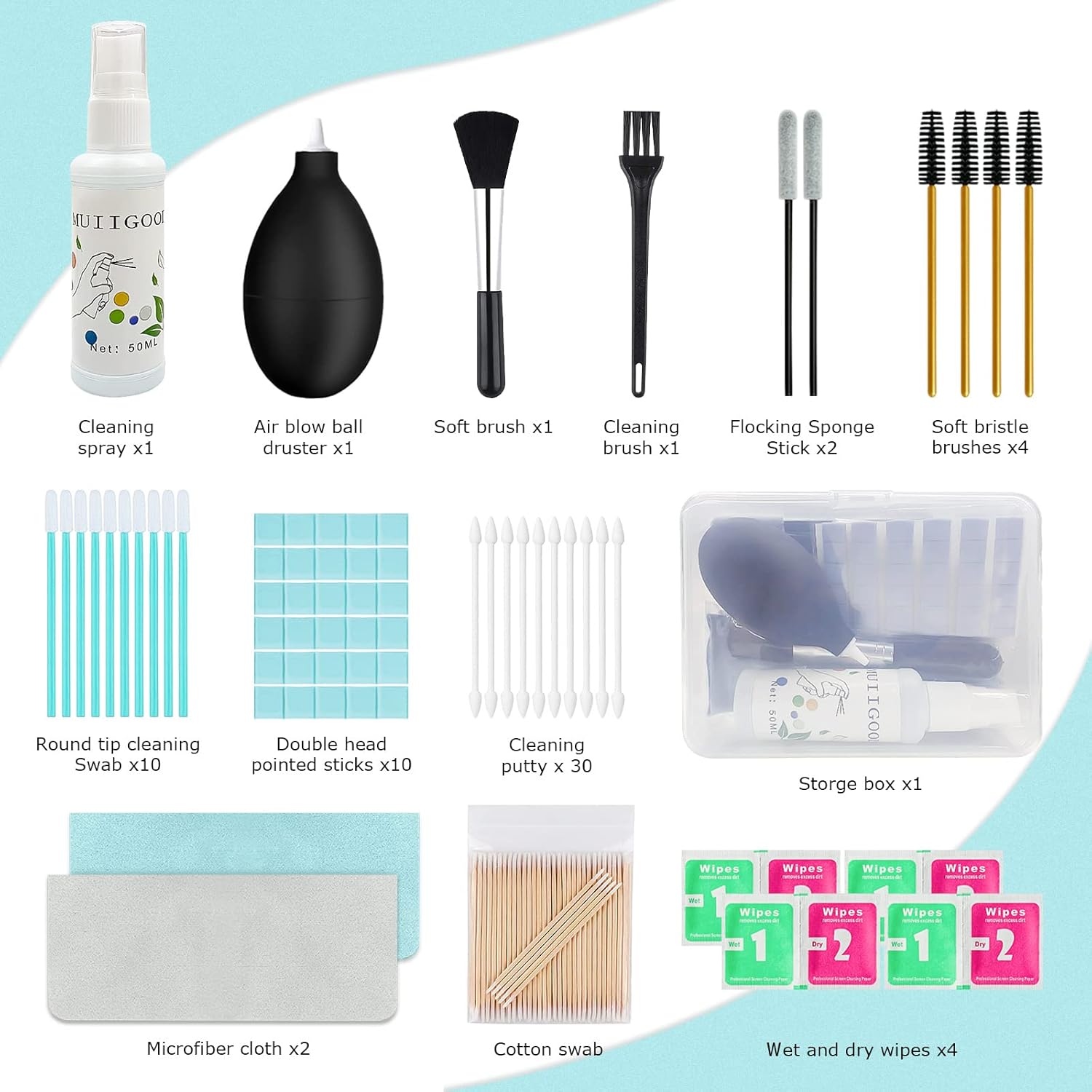 👍【WHAT YOU CAN GET- PACKAGE INLUDES 166 PCS】 1 Screen Cleaner Spray for Electronic Devices + 30 Cleaning Putty+ 1 Air Blower + 1 Soft Bursh+ 1 Cleaning Bursh +2 Flocking Sponge Stick+ 1 100 Double head pointed sticks + 10 Double head sponge swab +10 Round tip cleaning Swab + 4 Soft Bristle Brushes +4 Wet and dry wipes+ 2 Durable Microfiber Cleaning Cloth + 1 Storage Box.