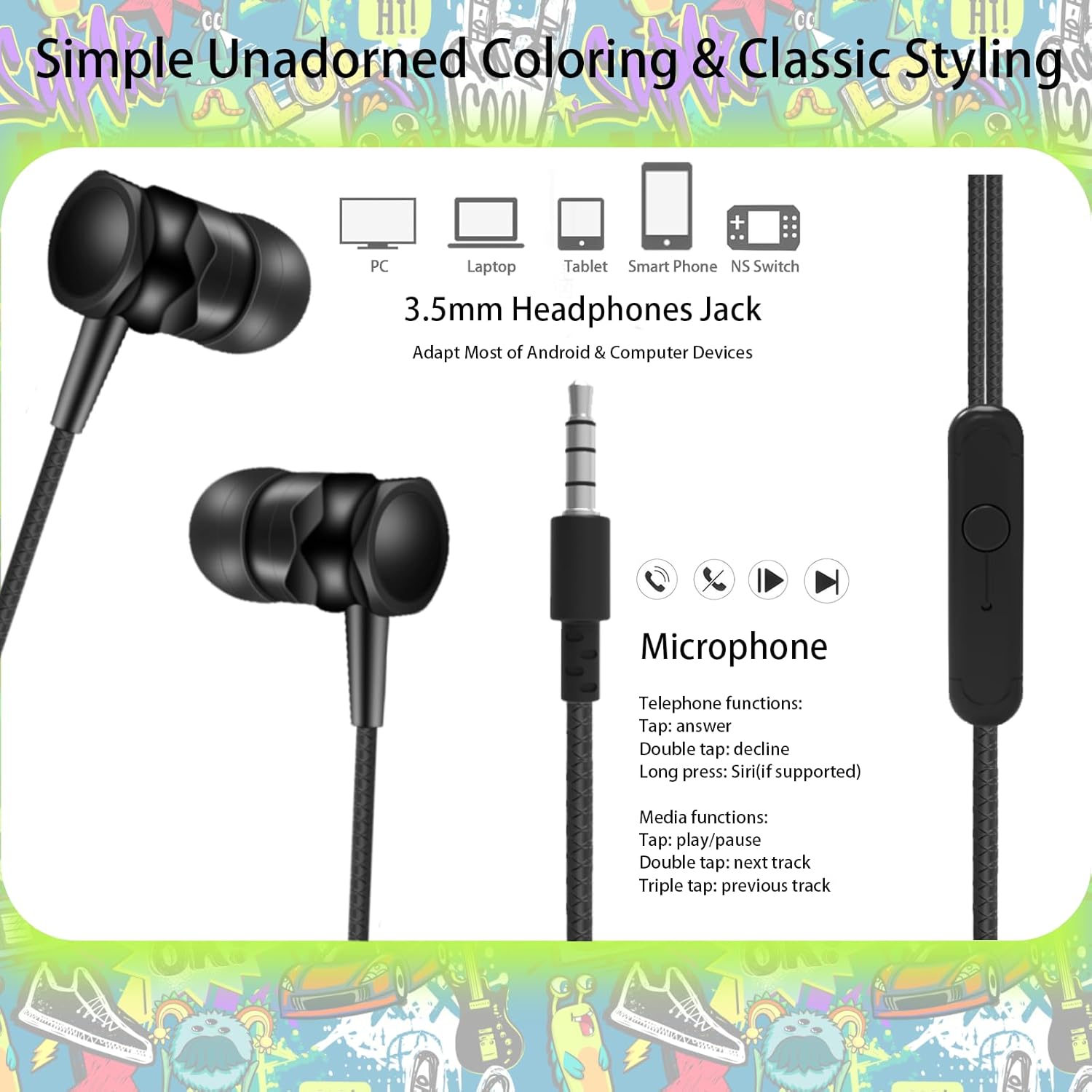 [HIGH-QUALITY SOUND HEADPHONES BRINGS SURROUND MUSIC] This multi-core technology headphones for kids with bass and surround sound to make music more dynamic and stereo. When kids are listening music or watching studying video, the wired earbuds deliver clear and crisp audio, with a built-in microphone for hands-free calls and voice commands. 3.5MM headphones jack is adapted to most of electronics like smartphones, computers, laptops, tablet PC, iPad and Switch.