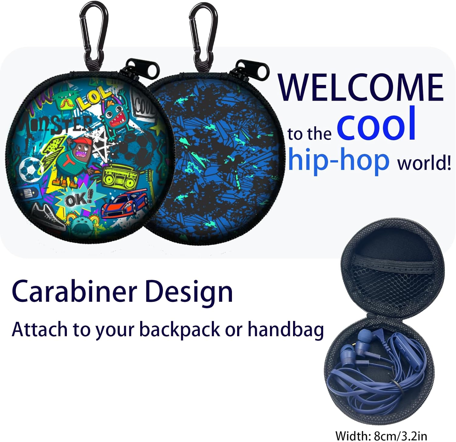 [EARPHONES CASE WITH MESH AND CARABINER FOR KIDS IN SCHOOL ] Kids can easily carry this earphones set with case on their backpack or hang bag by using its carabiner. This earphones set has mesh pocket design inside, it creates more storage and kids could put their earbuds, charger, cable and coins together in such small cute earbuds case. Adorable and unique case pattern makes this wired headphones set is popular for boys and girls 8-12 years old.