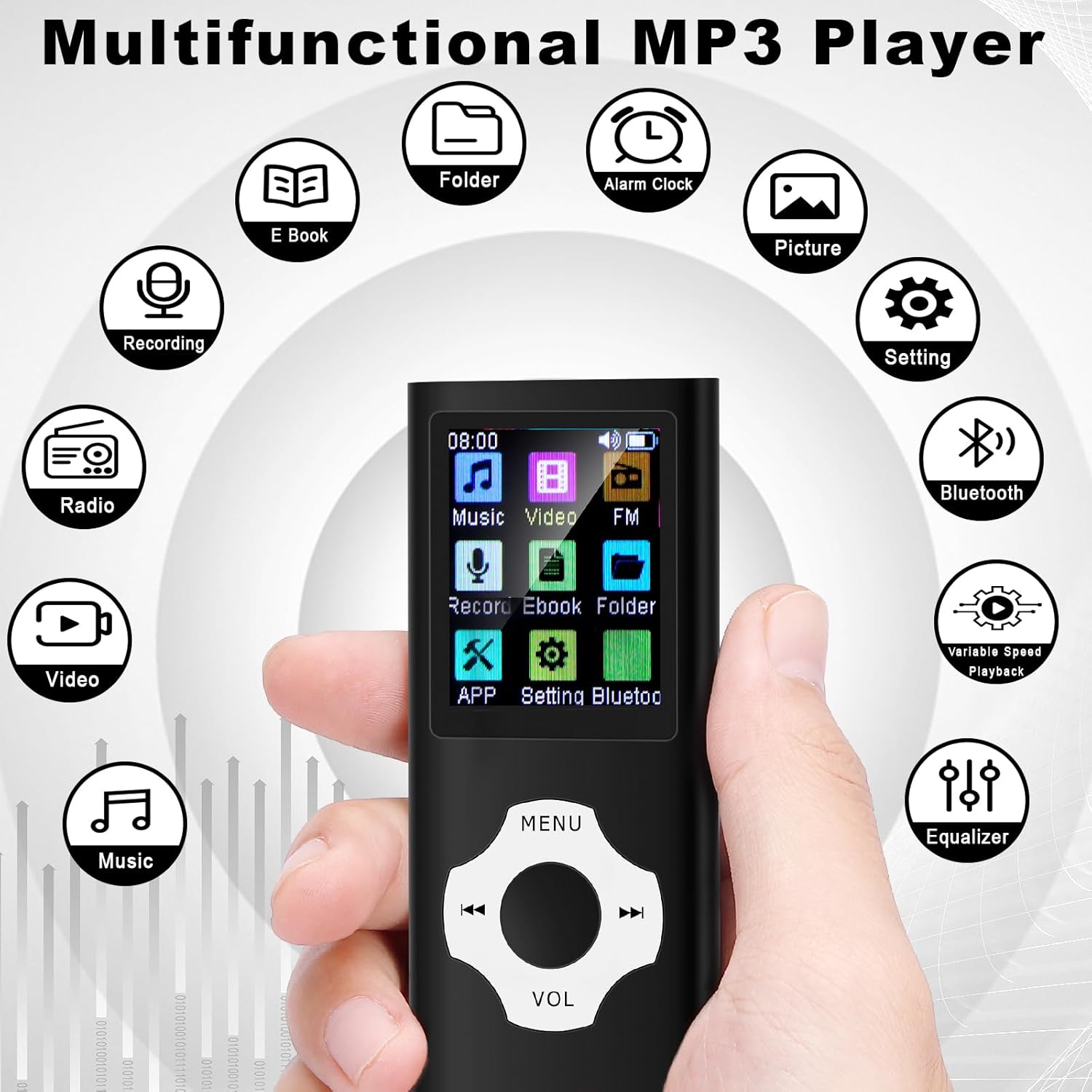 【 Multifunctional MP3】This MP3 player isn’t just for music; it also includes recording, FM radio, video playback, e-book reader, alarm clock, A-B repeat function, and an equalizer. Whether you want to listen to the radio, record important audio, watch videos, or read e-books, this versatile device adapts to your entertainment needs in various scenarios.