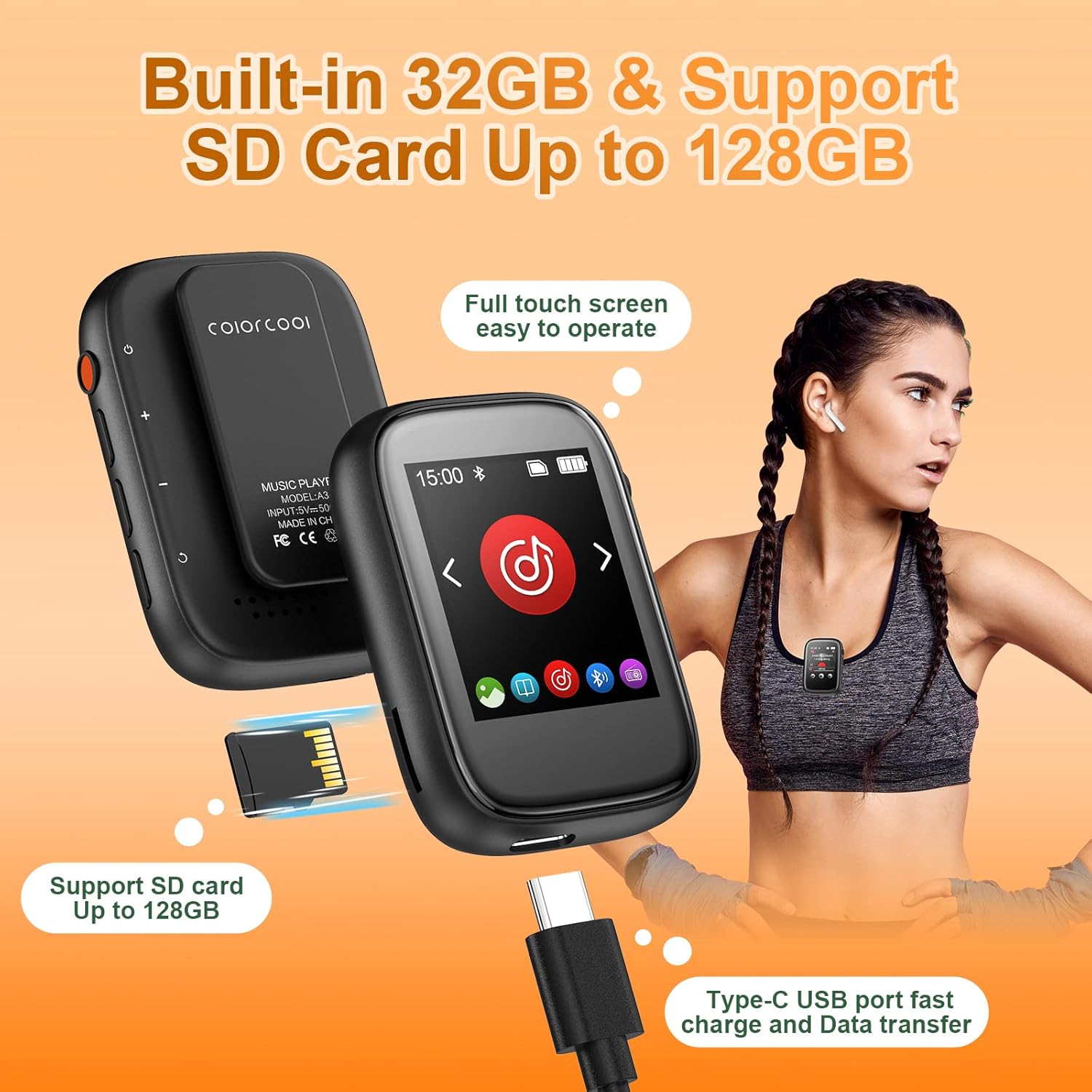 32GB Mp3 Player with Bluetooth 5.3,Portable Mp3 Mp4 Music Player with Clip,Good for Sports Support FM Radio Voice Record Built-in Micro SD Card Slot and HD Speaker Earphone Included