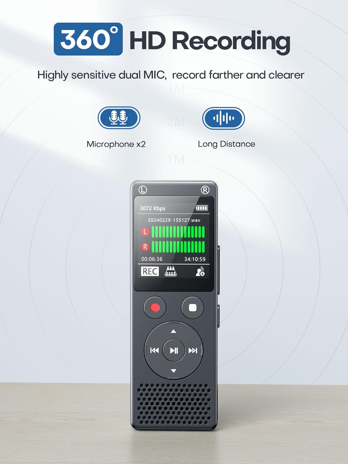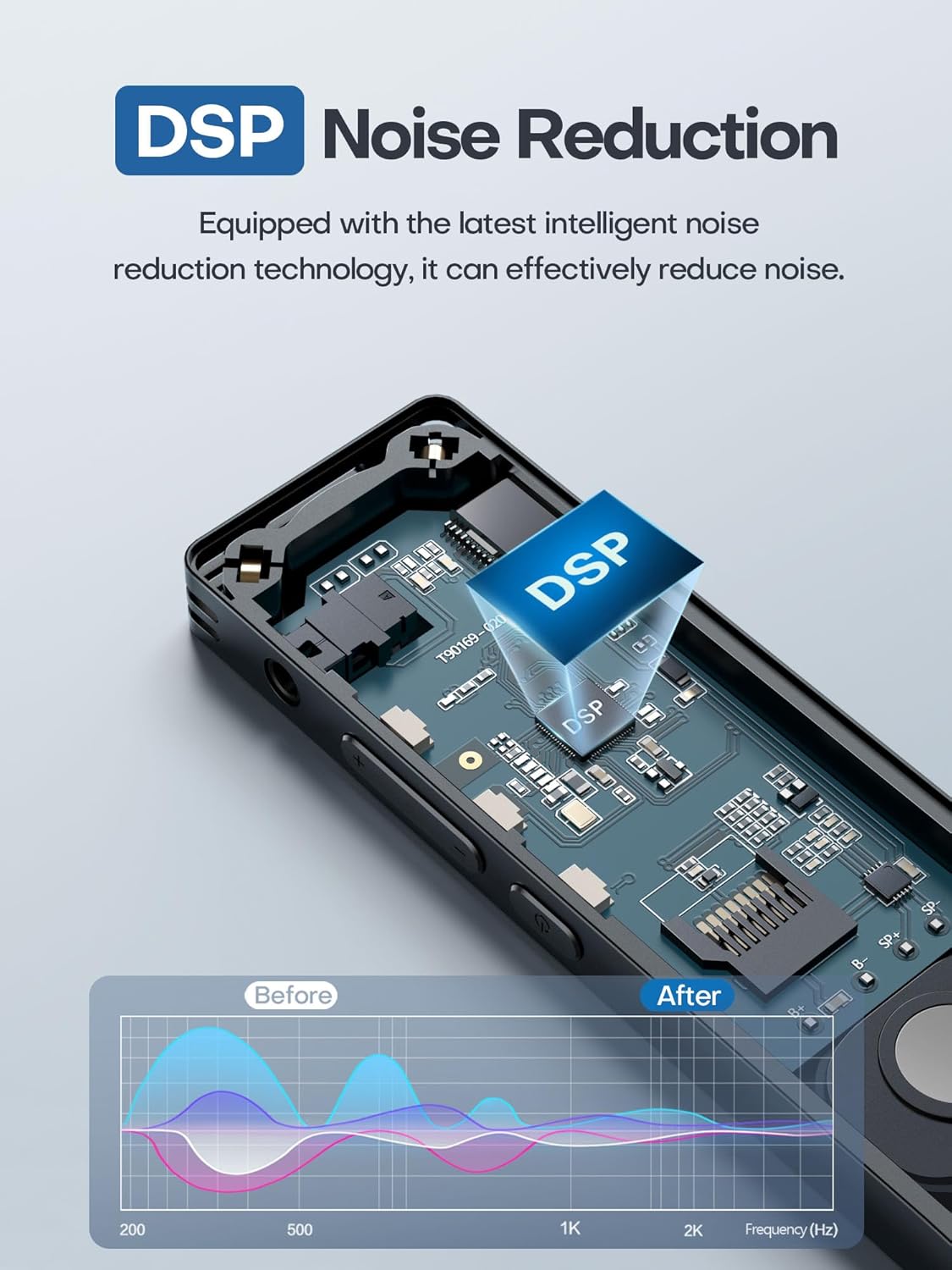 【DSP Noise Reduction & 360°HD Recording】The recorder is equipped with a powerful DSP noise reduction chip and two sensitive microphones, It can automatically reduce environmental noise,and record high-quality recordings. Support bit rate 3072kbps/1536kbps/512kbps.