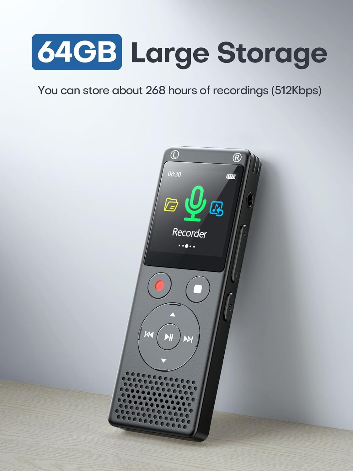 【64GB Large Storage Voice Recorder】64GB memory stores up to 268 hours of recordings (512kbps). It is equipped with 280mAh battery. The recorder can automatically save recordings when the battery is low.