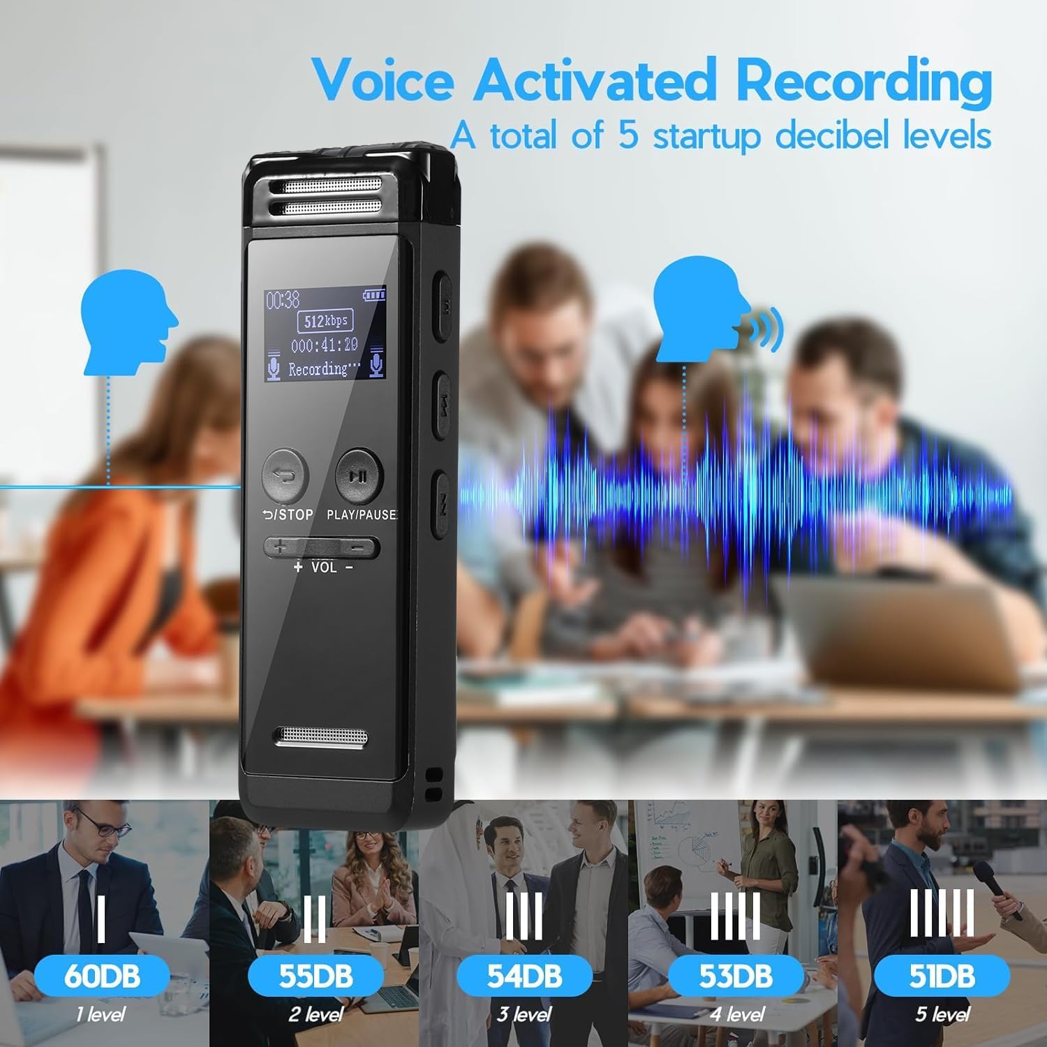 【Voice Activated Recorder】 Turn on the voice activated function, this audio recorder can set voice decibels at 7 different levels, Regardless the level of the volume, with correct voice decibel level, recorder will catch the speaking words only. No more silent whispers or snippets in your recordings, effectively saving the memory space and your listening time.