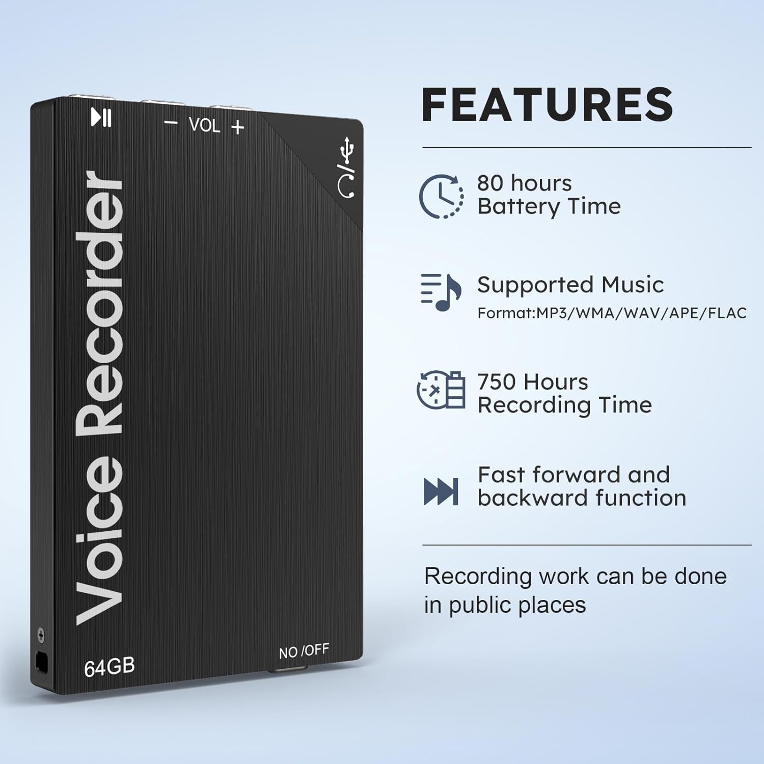 【What You Get】64GB Digital Voice Recorder Black, which can be used as MP3. You can import your favorite music into this voice recorder and listen to the music in your spare time.