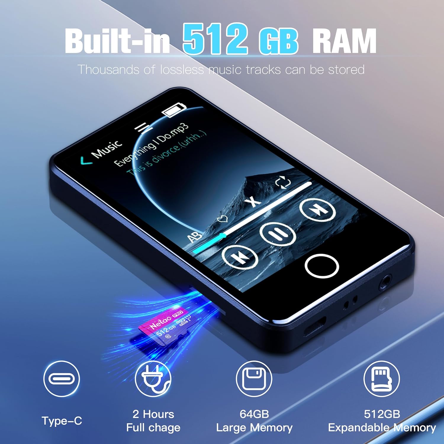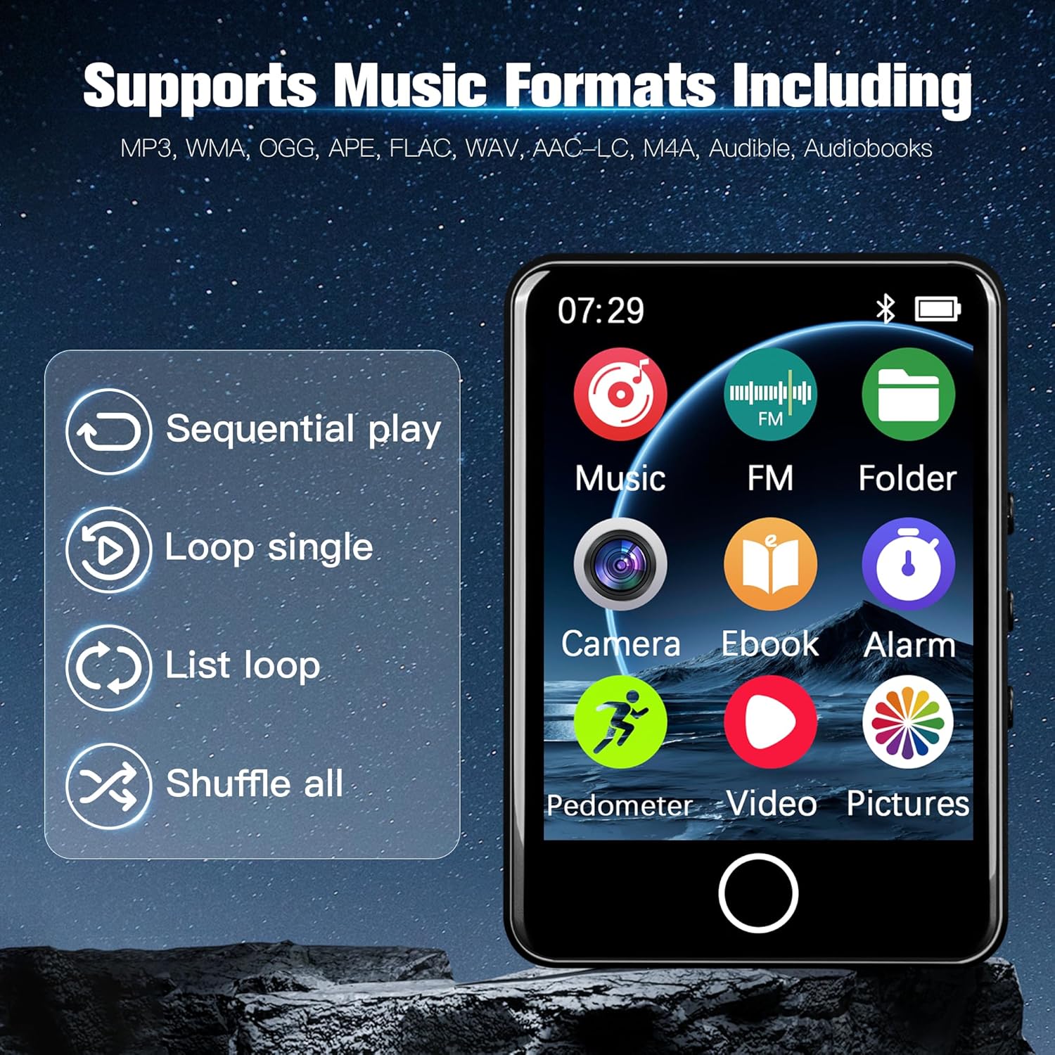 64GB MP3 Player,Portable MP4 Music Player with Camera&Bluetooth5.2, HiFi Sound Shuffle Single Loop FM Radio Built-in HD Speaker,Pedometer,2.8″ Full Touch Screen,50Hours Play Time,Up to 512GB