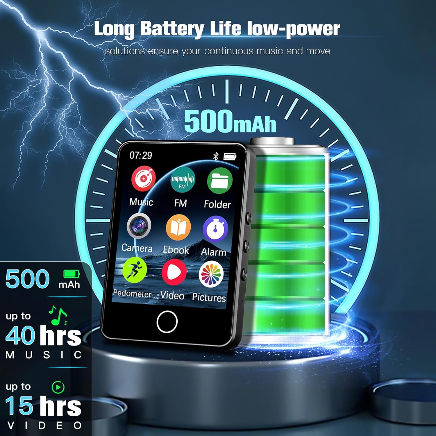 🎧【40Hours Playback Time】:X5 MP3 Player Built-in polymer battery of 500 mAH.When playing music, only 10mAH is consumed per hour.Long battery life brings a better music listening experience.