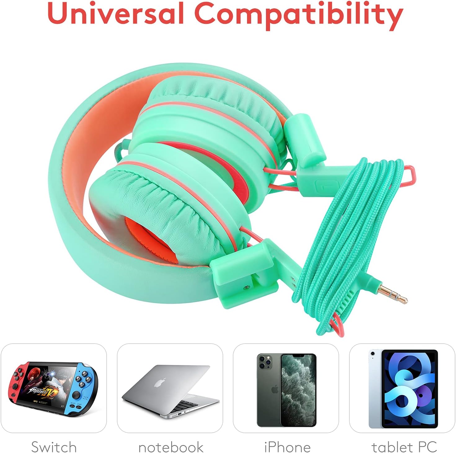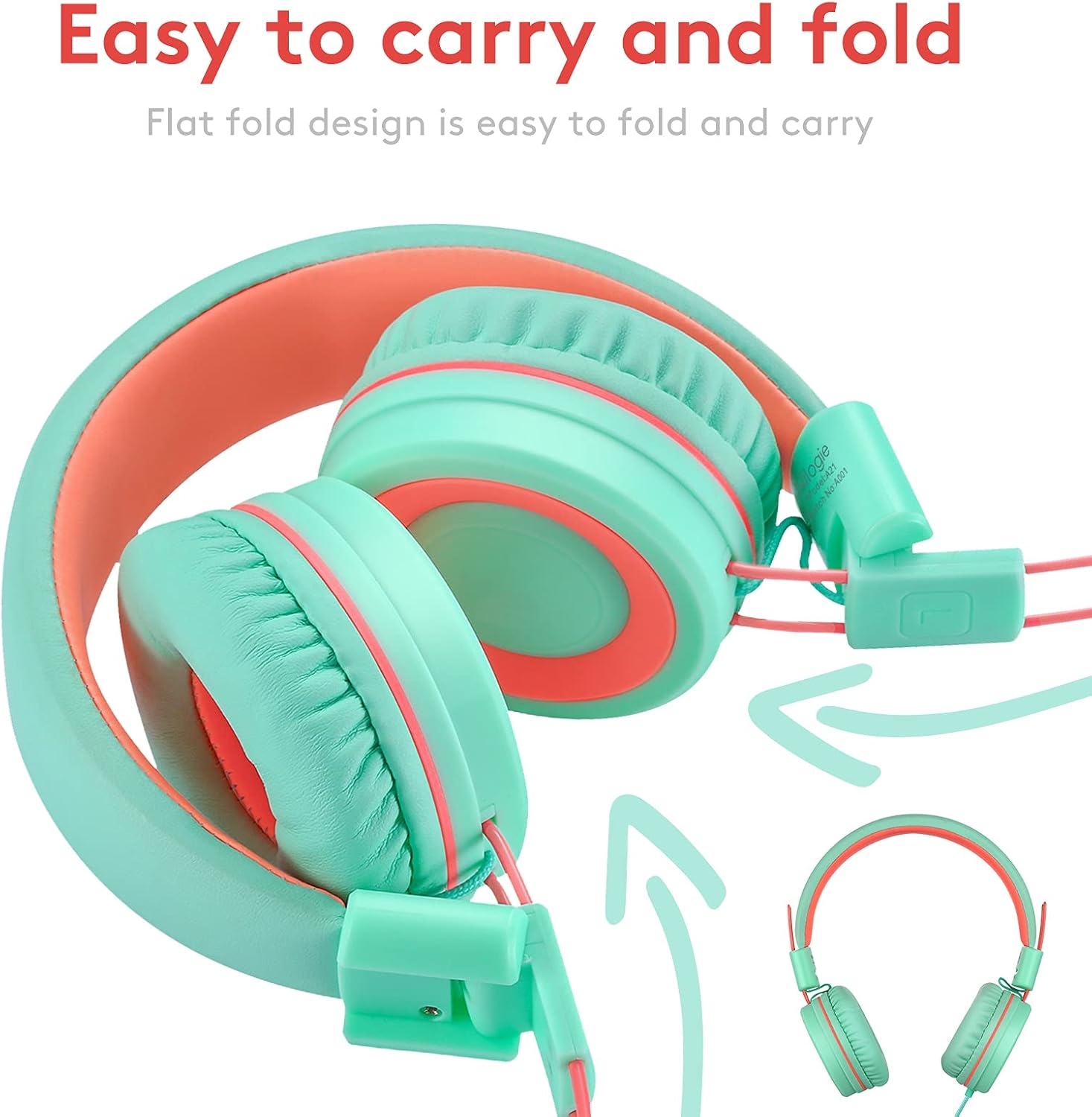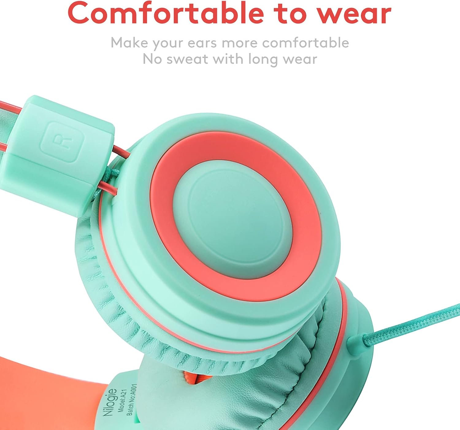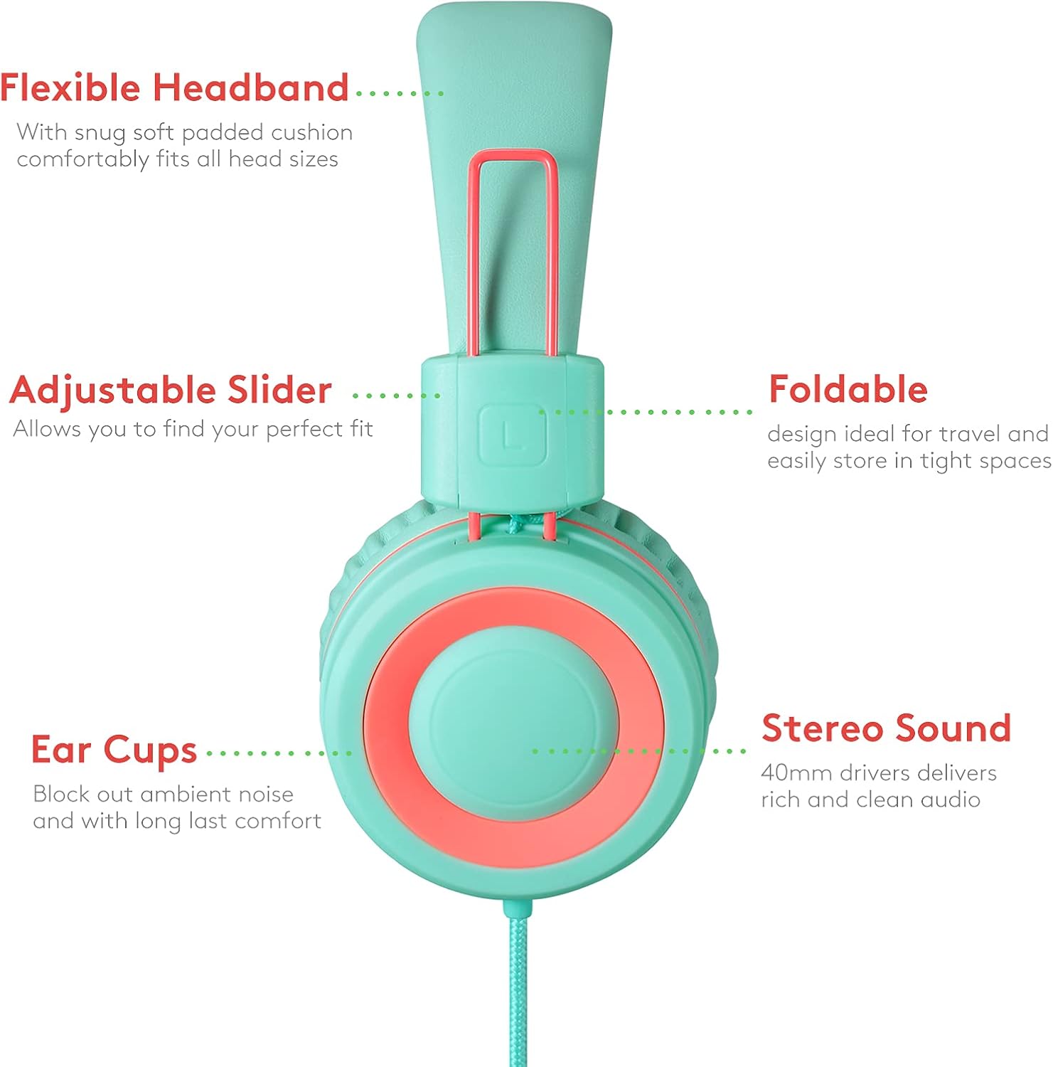 A21 Kids Headphones for School/PC/Cellphone/Airplane Travel with 3.5mm Jack Children Boys Girls Foldable Wired On-Ear Headset (Mint Coral)