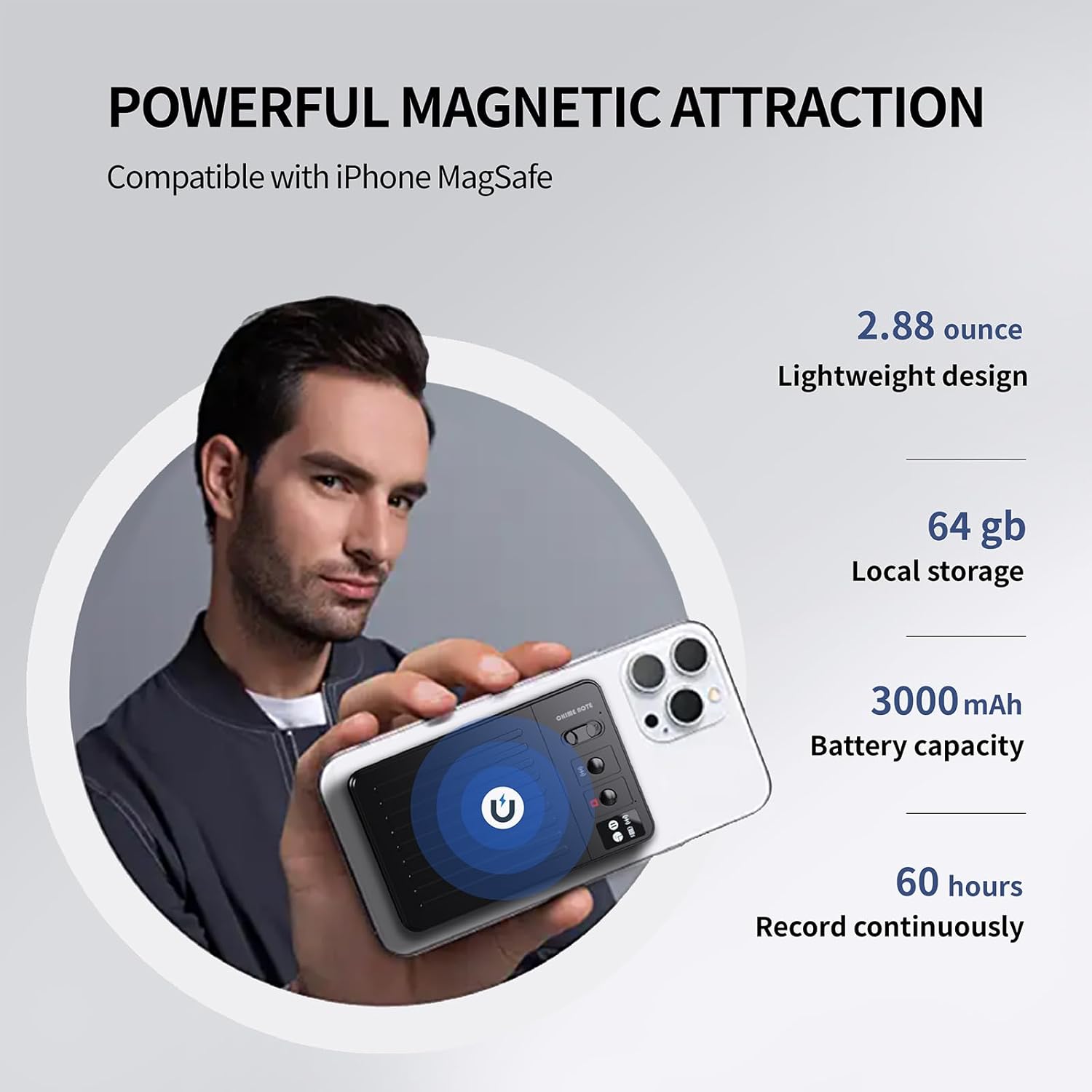 STRONG ATTRACTION: Our portable audio recorder is MagSafe-compatible and easily attaches to an iPhone or iron. Enjoy seamless recording without phone amplification. This micro recording device is convenient and practical.