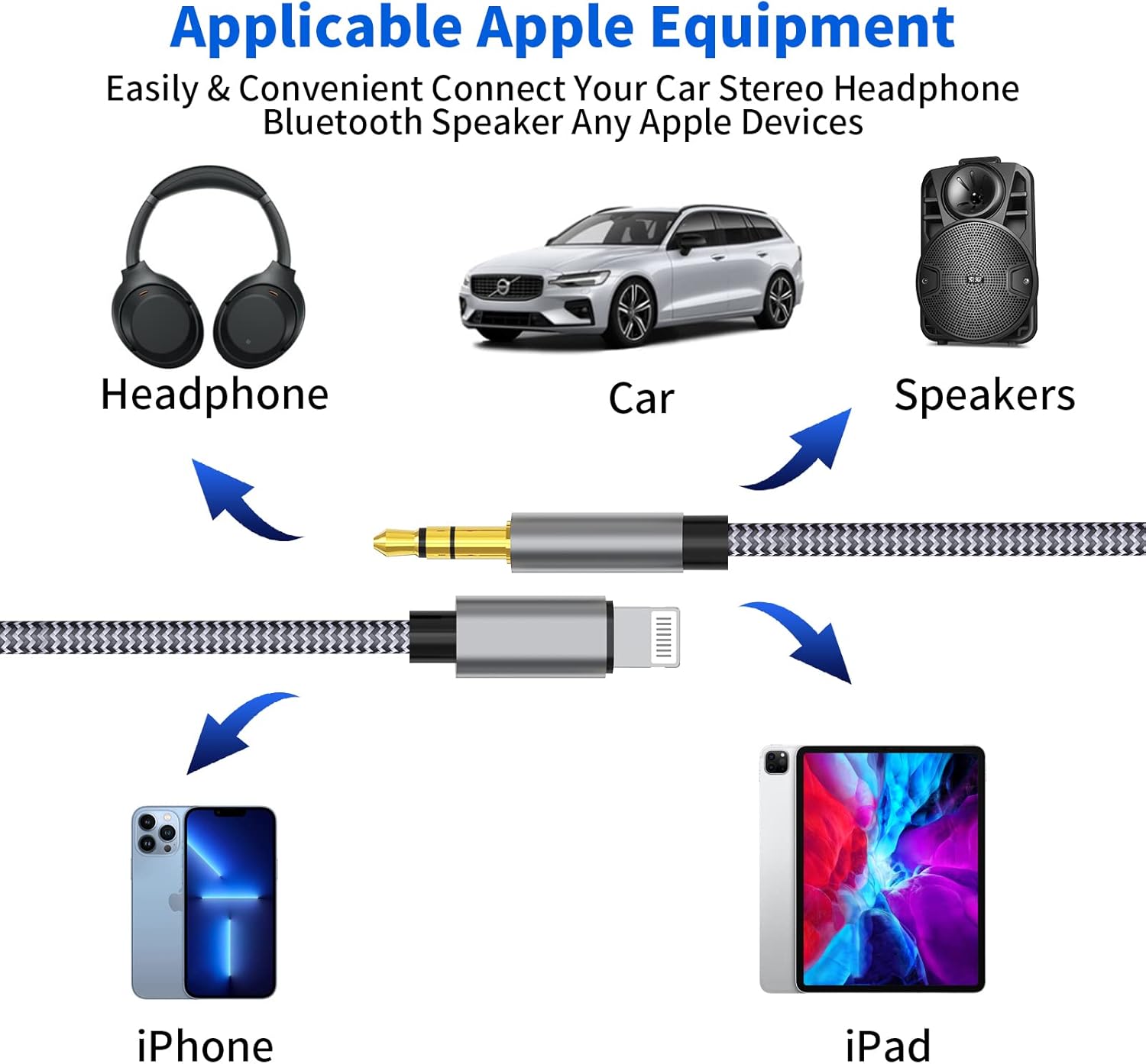 【Newest Version】Apple MFi Certified, Now you don’t worry your iPhone appears “IT DOESN’T SUPPORT THIS PRODUCT”. The aux cord for iPhone/iPad adopts the newest chips, it can support all ios version (including iOS 10/11/12/13/14/15/16 and later). This cable compatible with multiple devices, such as iPhone 14/13/12/11/X/XS/XR/8/7/, iPod touch, iPad Mini/iPad Air/iPad Pro
