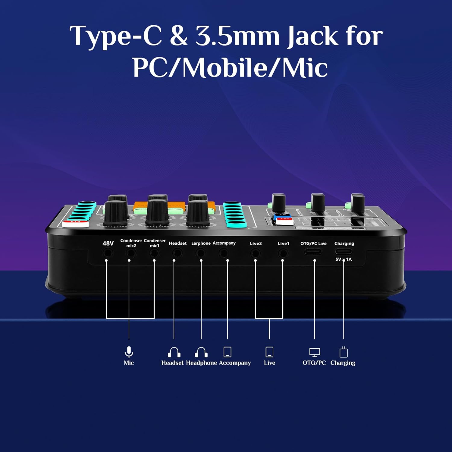 Audio Mixer Potable 48V Sound Board Plug Play Voice Changer for PC Phone Gaming Karaoke Studio Recording Podcast Live Streaming