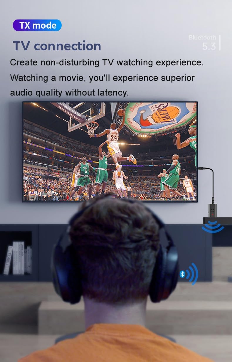 Low Latency-This bluetooth TV transmitter allows you to enjoy high-definition sound that is perfectly synchronized with the screen when watching ,movies or TV programs.