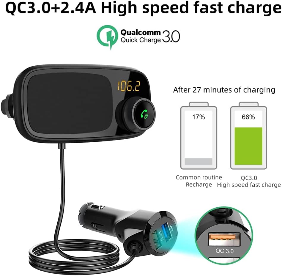 FANTASTIC SOUND QUALITY — This FM Transmitter allows you to enjoy crystal clear podcasts and 2 stereo music player modes: A. Bluetooth, B. TF card(≤ 64GB). Support MP3/WMA/WAV/FLAC format music