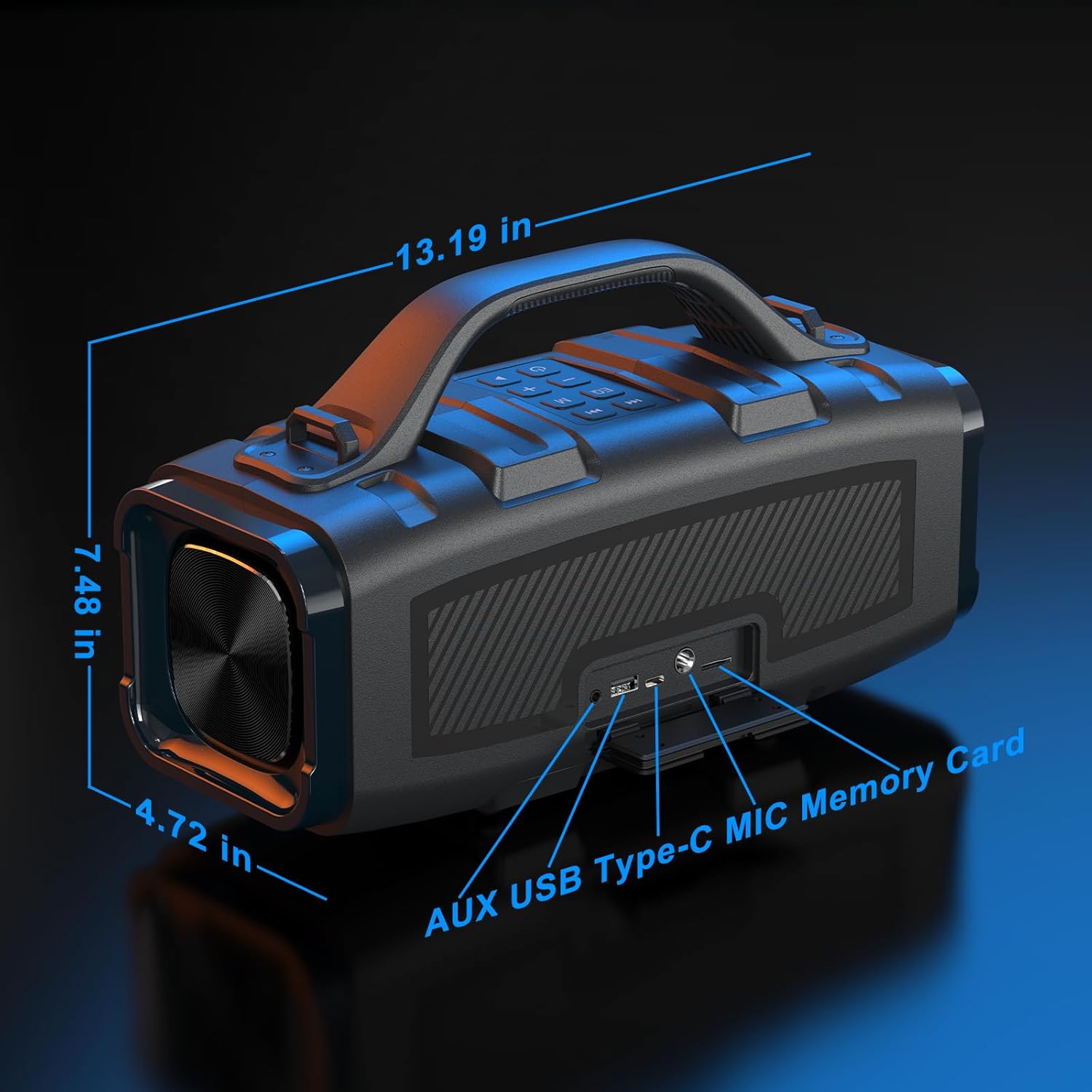 Stylish Design: The front of this boom box speaker is covered by a metal grid which is durable and with a nice touch. You can bring the portable speaker bluetooth to sport field or beach, and no need to worry about it being damaged. You can easily grab it with the handle at top. This pack comes with a strap, and you can carry it on and take it anywhere.