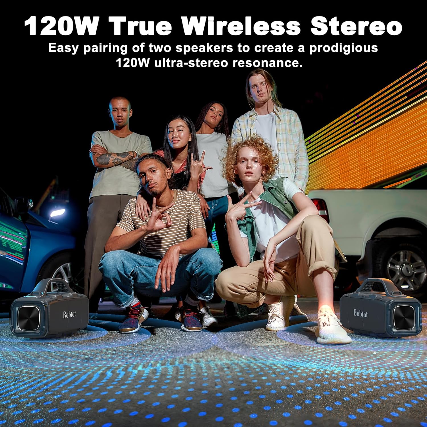 120W True Wireless Stereo: Bluetooth 5.3 ensures a faster and more stable connection up to 100ft compared to others. TWS function allows you to pair 2 speakers to get stereo sound at 120W peak power. When you play music, watch movies, or play games, this wireless speaker with bluetooth can bring you larger sound space, clear vocals, deep bass, and crisp highs. Perfect for music enthusiasts who want a dynamic and immersive listening experience.