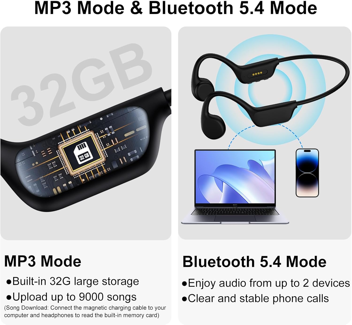 【Bluetooth 5.4 Technology】The open headphones use advanced Bluetooth 5.4 technology for faster transmission speeds and more stable connections. You don’t have to worry about Bluetooth disconnection when listening to music, audiobooks, podcasts or making phone calls. (Underwater Bluetooth signal transmission may be limited when swimming, please switch to MP3 mode)