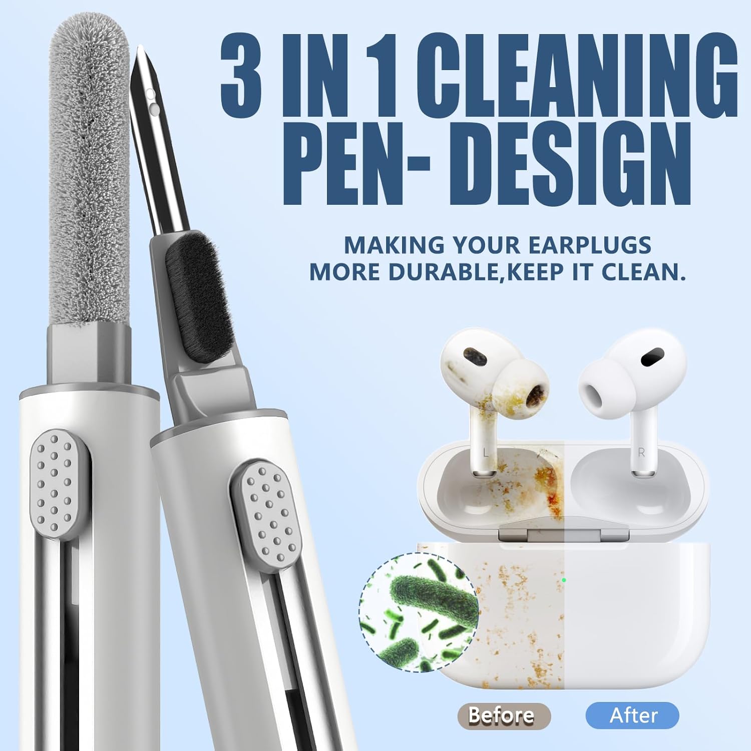 🧹【 Three in one】Convenient Double-head hidden design, cleaning pen will meet the cleaning needs of many situations. including 3 parts。 flocked sponge, can clean the charging compartment. high-density flocked tip which can deeply clean the tiny parts and holes of the earplugs. metal nib which can clean the small parts and holes of the earplugs for deep cleaning of crevices and stubborn dirt.