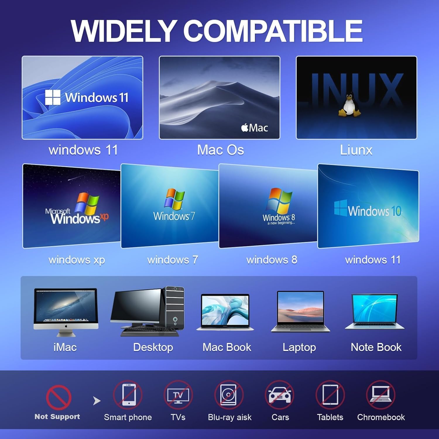 【Wide Compatibility】This USB 3.0/Type-C External CD/DVD drive is compatible with all brands of Windows 11/10/ 8.1/ 7/Vista/ XP or Linux laptops and desktop PCs (including HP, LG, Dell, Lenovo, Thinkpad, MSI, Samsung, Mircosoft Surface, etc.), and all versions of Apple Mac computers (Including M1 and M2),Comprehensive Computer, Internal PC hard disk reader