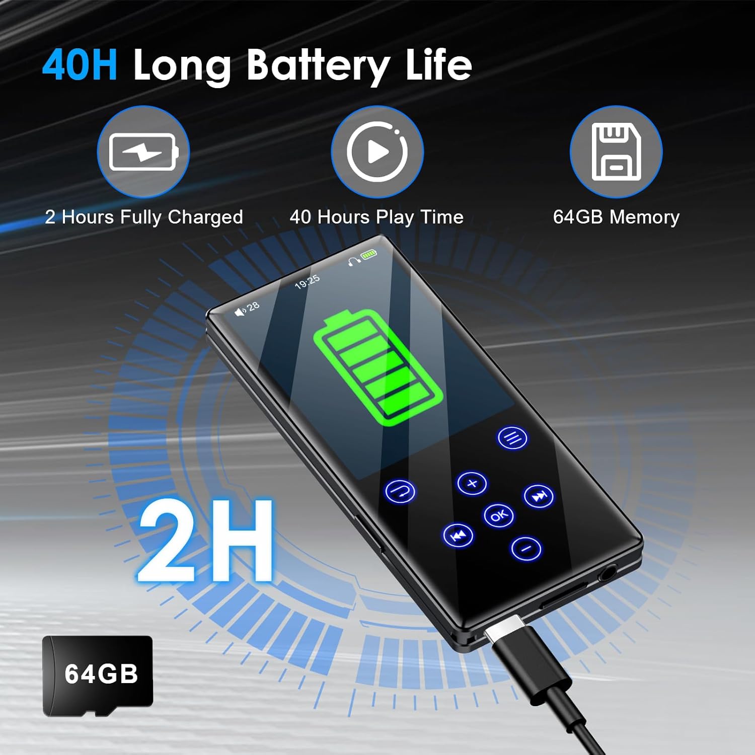 MP3 music player comes with 64 GB of built-in memory. You no longer have to worry about running out of storage space, which can easily download and store thousands of songs to enjoy music better, while you can enjoy music anytime and anywhere.