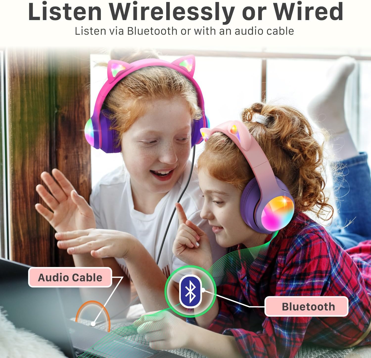 FosPower Kids Bluetooth Headphones with LED Cat Ears (85/94dB Volume Limit & 60H Play Time) Foldable Wireless/Wired Headset with 3.5mm Cable for School/Travel – Hot Pink/Purple