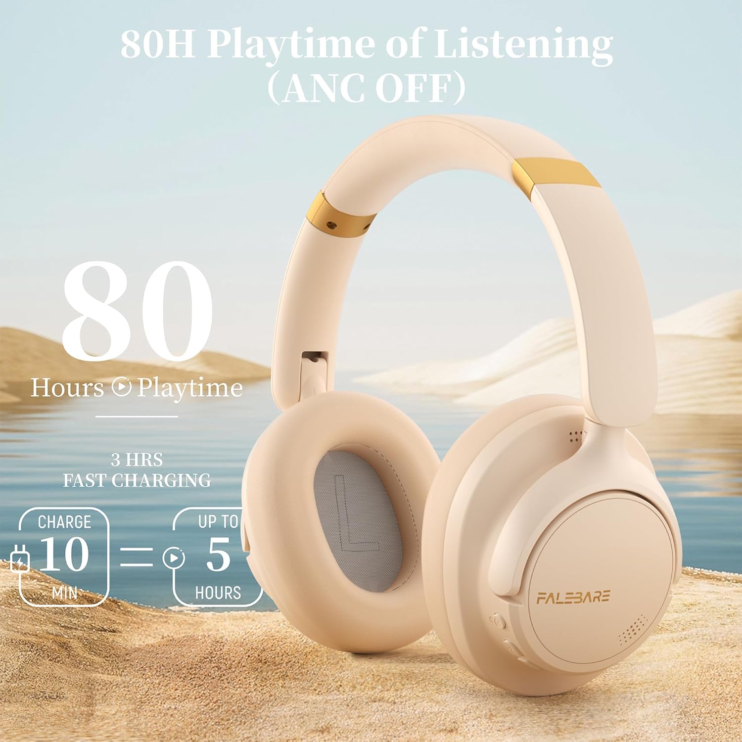 [80 Hours of Playtime] Over ear noise cancelling headphones provide up to 80 hours of playtime (ANC OFF) and 60 hours of music time (ANC ON). Active noise cancelling headphones with Type-C fast charging meet a 10-minute charge to provide 5 hours of playtime. When you run out of power while travelling, noise reduction headphones allow you to continue listening via the 3.5mm audio cable included in the box