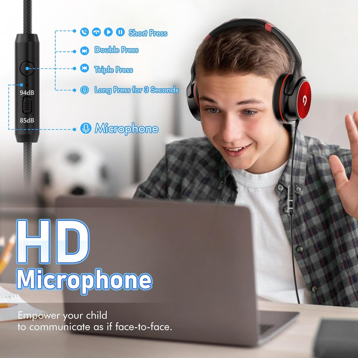 Kids Headphones with Safe 85dB/94dB Volume Limiter for Teen and Boys, Foldable HD Stereo Sound Headphones for Kindle Kids/fire Tablet/iPad/Laptop, Headphones with Microphone (Black-red)