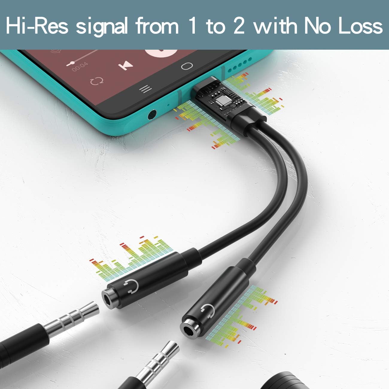 ★【Hi-Res Sound Quality — For Both Headsets】This USB C to dual 3.5mm aux splitter use built-in newest Realtek DAC chip which will stable decoding 32bit / 384khz sound quality signal & Losslessly transmit them to the 2 headsets you connected, Without a single bit quality reduce !! SNR 100+dB