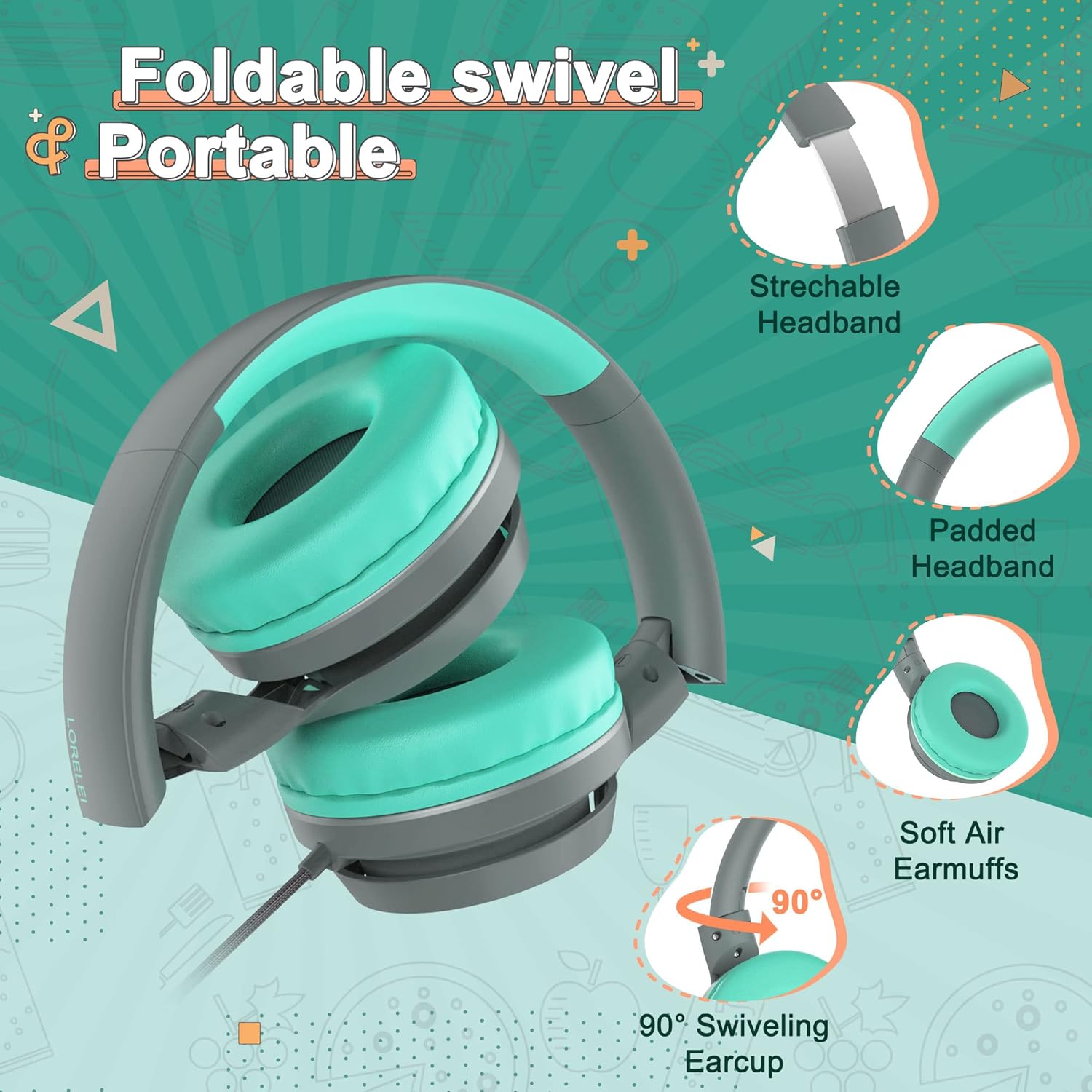 LORELEI E7 Kids Headphones with Microphone,On-Ear Wired Headset for Children/Boys/Girls,85/94dB Safe Volume,Foldable&Rotatable3.5mm Tangle-Free for School/iPad/Laptop/Travel (Grey&Green)