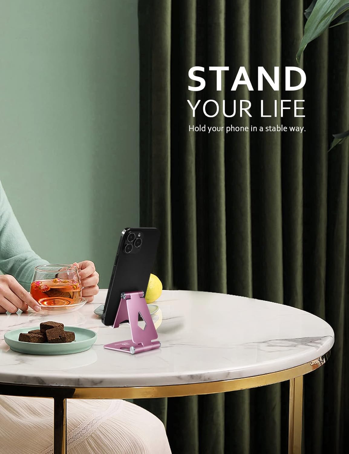 MULTI-ANGLE ADJUSTABLE: Our foldable cell phone holder stand offers multiple viewing angles, allowing you to find the most comfortable position for watching movies, FaceTiming, playing games, or learning recipes in the kitchen, hands-free and conveniently.