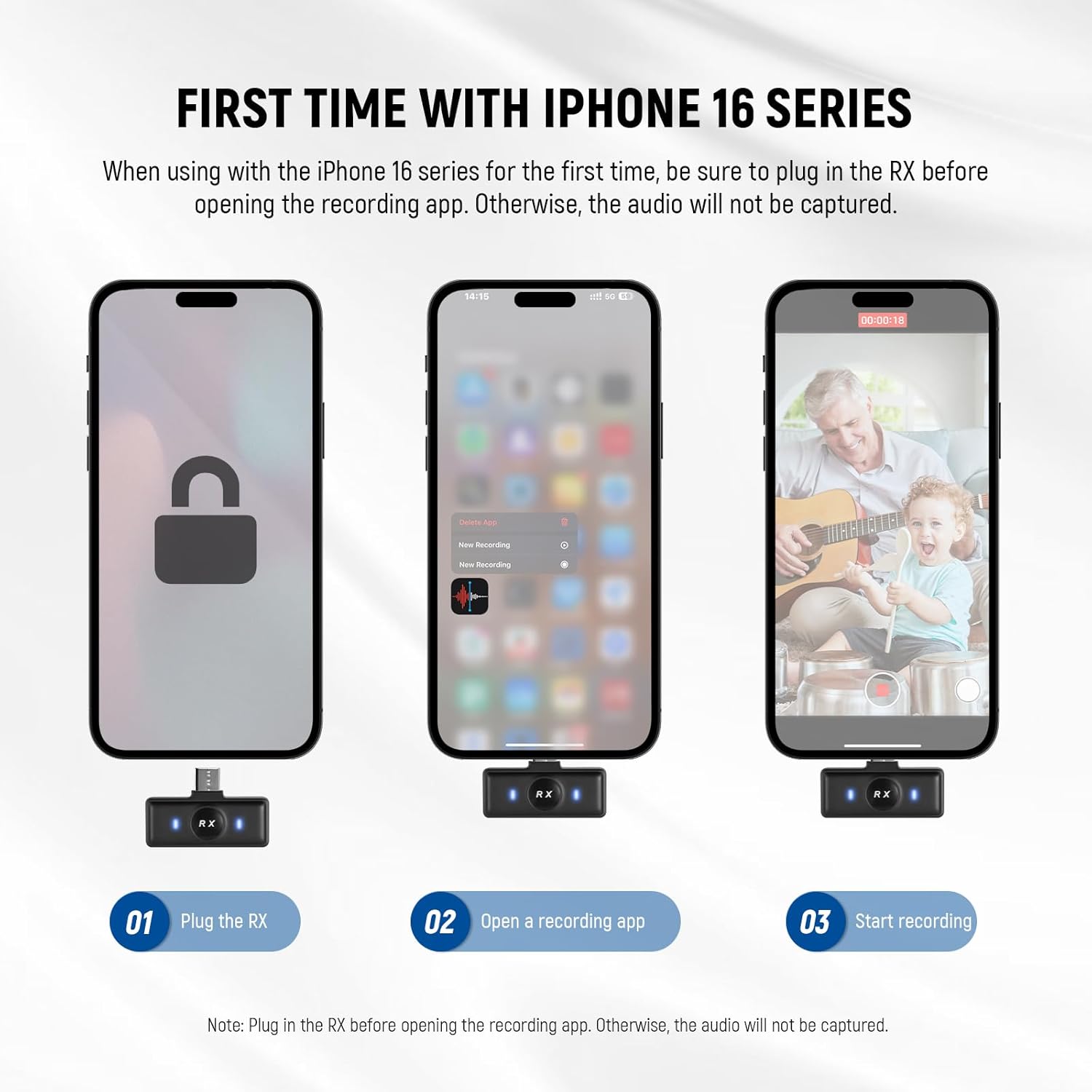 【Plug and Play, Wide Compatibility】 Without any complex setup, the TX and RX will automatically pair with each other. The RX automatically pairs with the cell phone and tablet when plugged in, no need to connect to Bluetooth or APP. This tiny external omnidirectional condenser cordless mic is compatible with iPhone (with OTG adapter), Samsung Galaxy S23 S24 Ultra, other smartphones, PCs, or laptops with a Type C interface