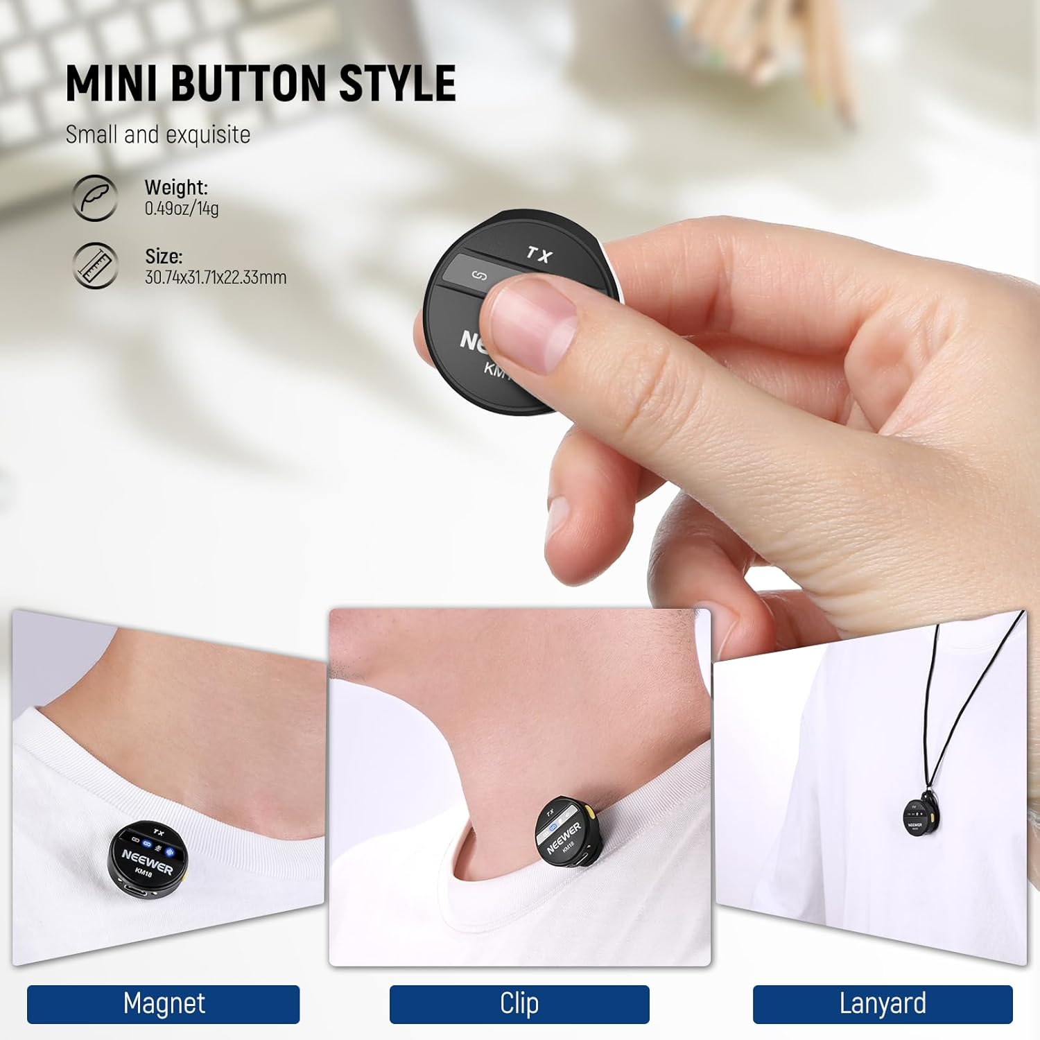 【Button Shaped Wireless Microphones】 Innovated with the mini button shape design, each transmitter weighs only 0.49oz (14g). This wireless lavalier microphone system features a 48kHz/24bit audio format, capturing every sound with optimal accuracy. It ensures excellent audio signals with minimal background noise at a 70dB signal to noise ratio and handles a maximum 115dB sound pressure level for recording in environments with high pitched sounds. Support one click mute