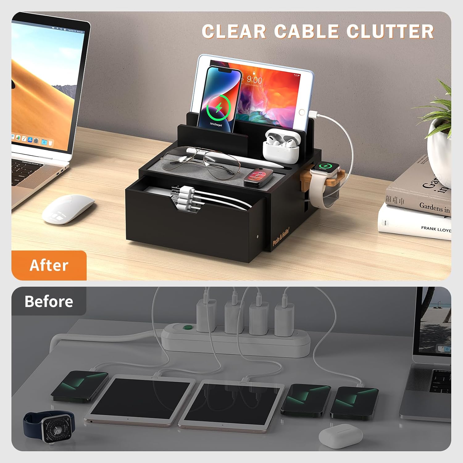 Multi-device Organizer: Pezin & Hulin bamboo charging station stand can hold up to 7 devices (such as phone, tablet, smartwatch, earbuds, and more electronic devices), simultaneous maintaining your devices in order and helps to clean up the stacking device charging