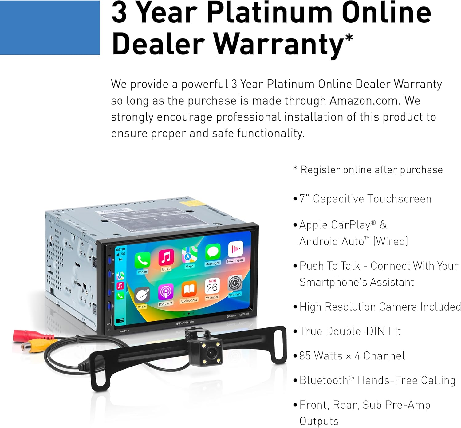 Planet Audio provides a powerful 3-year platinum online dealer warranty so long as the purchase is made through Amazon.com. We strongly encourage professional installation of this product to ensure proper and safe functionality