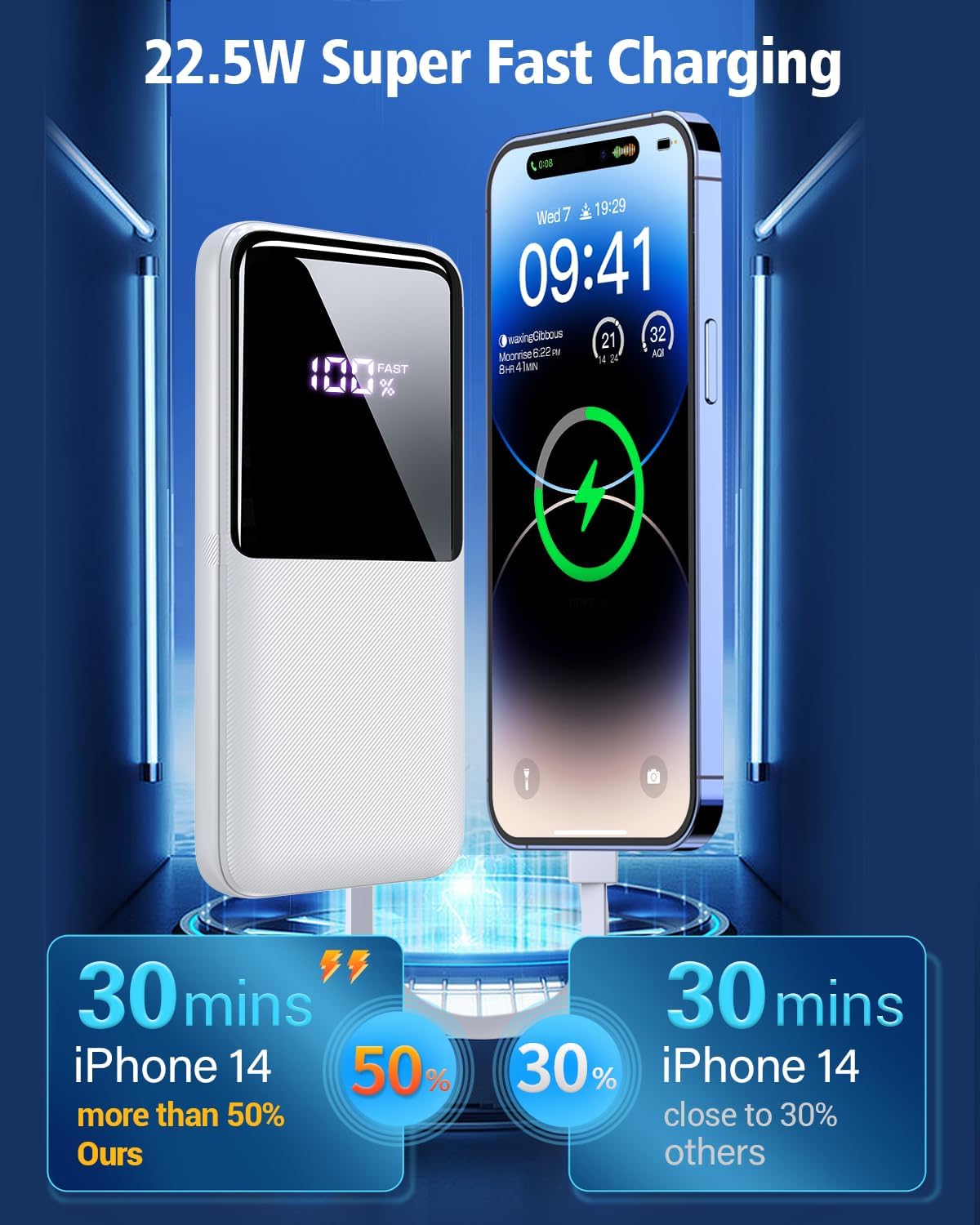 PD22.5W Fast Charging Battery Pack >>>: CFIAI portable phone charger combines the most advanced PD & QC fast charging technologies, the USB C cable supports PD22.5W, iOS cable supports 20W, USB C port support 18W, USB A port support 15W. Incredibly fast fuel your iPhone 15 form 0 to 50% in 30mins, nearly 3X faster than original chargers. Get rid of the anxiety of low battery, have PB-08, no need to wait for endless charging!