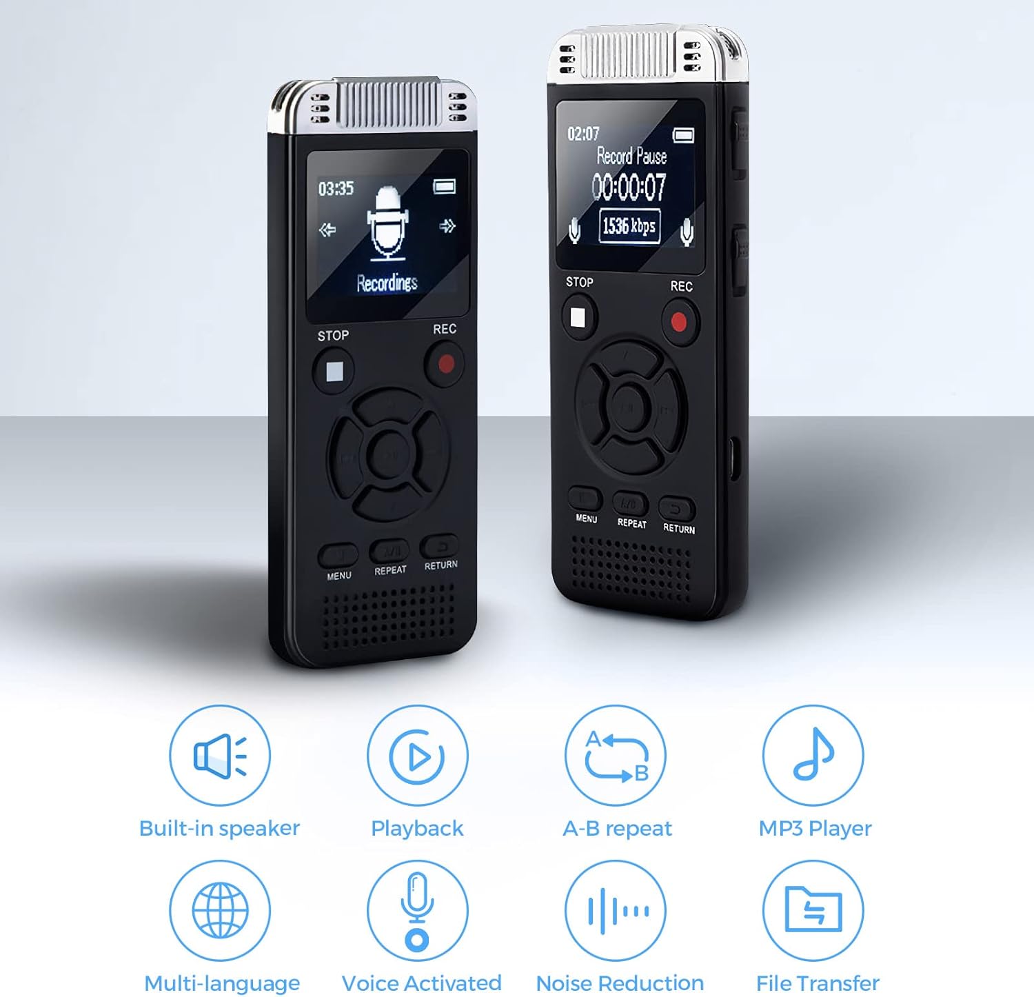 【Multi-Functions】Compact and portable size, voice recorder works with all the functions you want: *File Transfer, Built-in speaker, 3.5mm Earphones(included), Playback, A-B repeat, Multi-language, Voice Activated, Noise Reduction, MP3 Player.