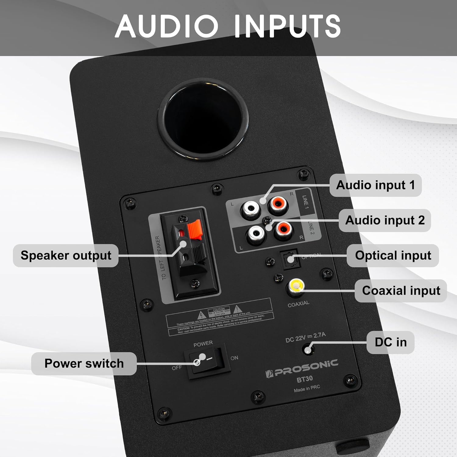 Prosonic BT30(2023 Version) Active Powered Bluetooth Bookshelf Speakers, Studio Monitor, Home Theater, Turntable with Optical Input, Coaxial Input, 2X RCA Aux Line Input, 80 Watts, (Black)
