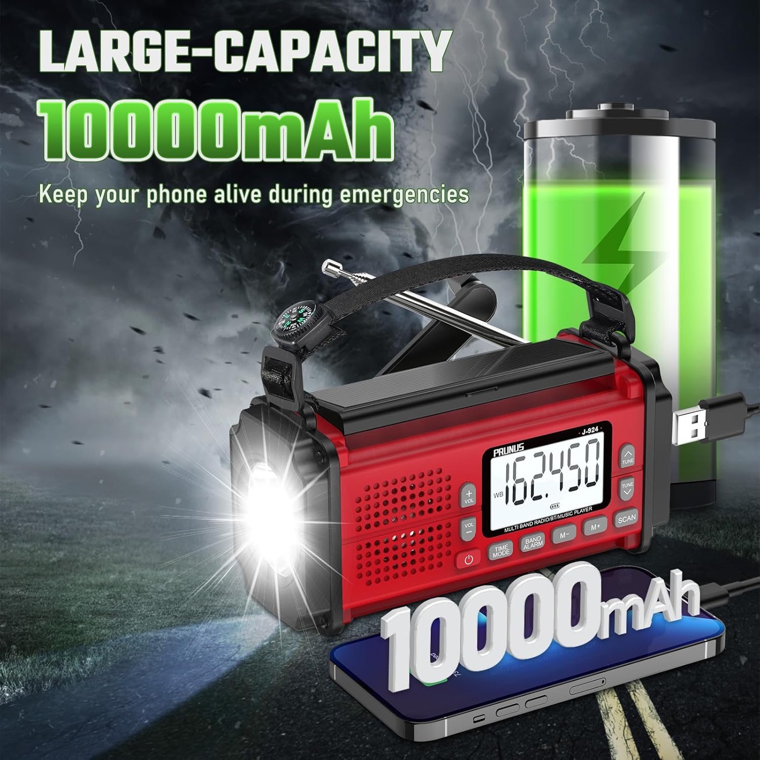 PRUNUS 924 10000mAh/37000mWh Hand Crank Radio, AAA Batteries Powered Emergency Radio Solar, NOAA Weather Radio AM/FM/SW, USB Charging, Torch& Reading Light, SOS Alarm, Power Bank, Compass for Camping