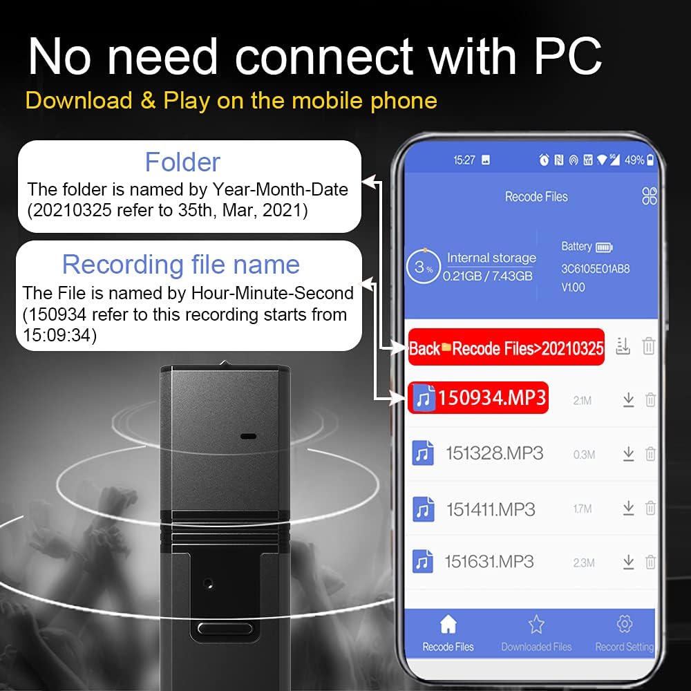 No Need Connect With Computer: use mobile phone to read the recording files and set the recording parameters, including voice control sensitivity, voice quality, recording period, mute time. The recording file folder is named by Year-Month-Day, and recording file is named by Hour-Minute-Second, which is very easy to find.