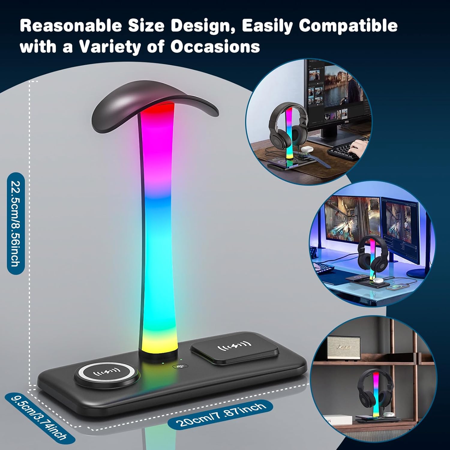 BAISHUN 4-in-1 RGB Headphone Stand with Wireless Charging can hold 1 headphone and charge 3 devices at the same time, and will keep your desk clean and tidy!