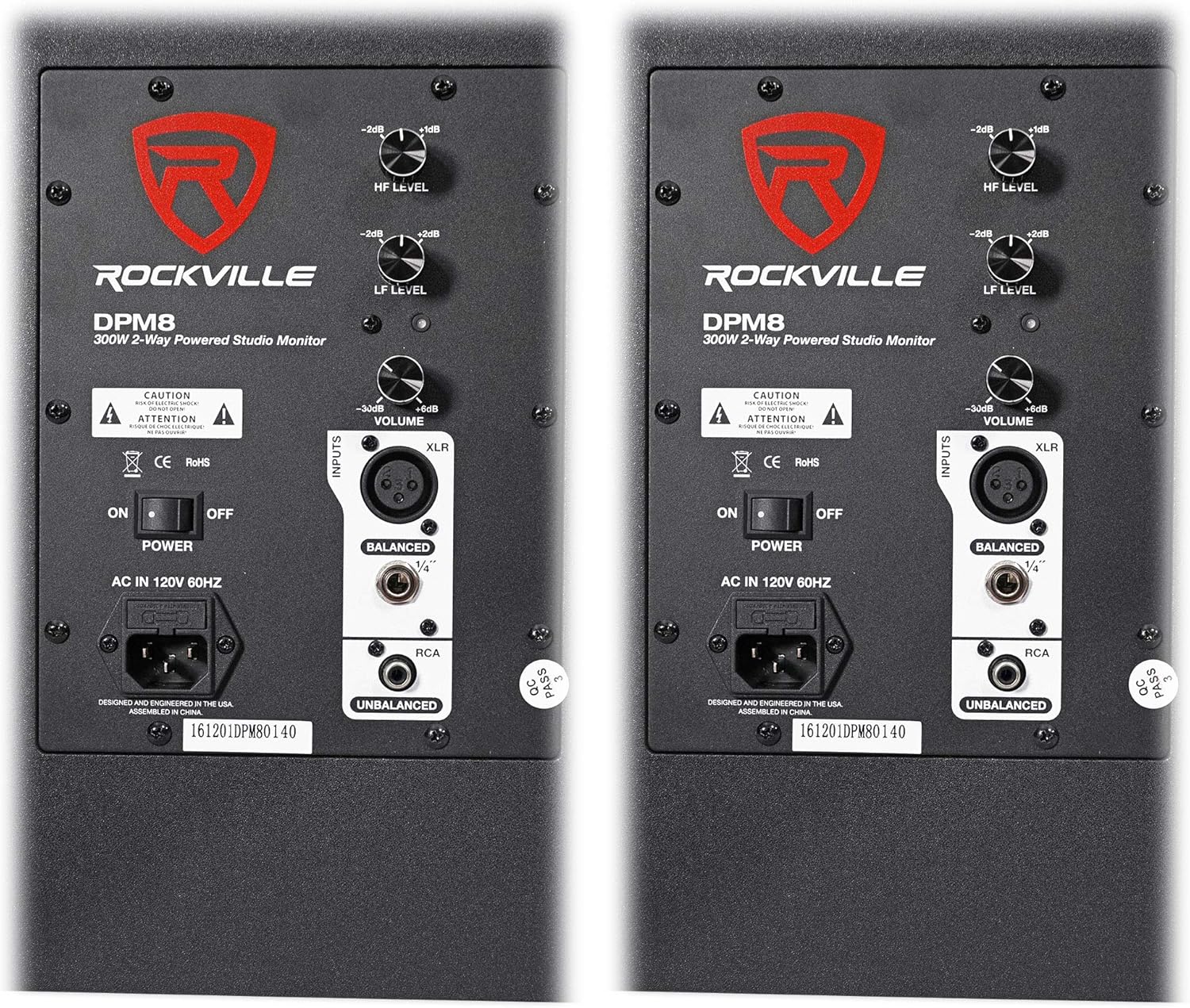 Features of DPM8B (You will get 2 of these). RockvilIe DPM8B 8″ 2-Way 300W Active/Powered Studio Monitor Speaker in Black. Peak Power: 300 Watt. RMS Power: 150 Watt. Bi-Amped: 45 Watts for highs, and 105 watts for the lows. Enclosure is made of top quality MDF wood. Our enclosure is not particle board; it is true high-grade MDF! The enclosure is 0.5 thick around while the front board of it is a full 1 thick to give you the ultimate best sound quality!