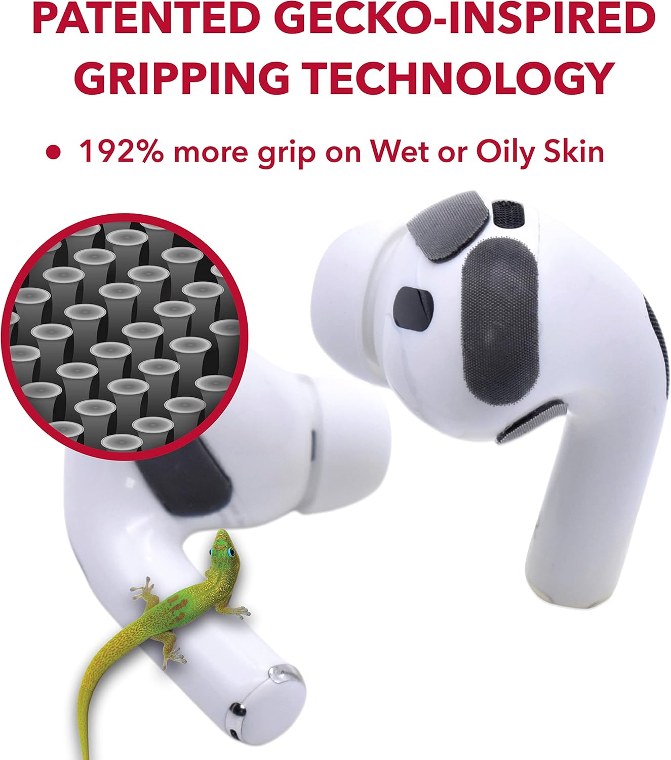 GECKO INSPIRED MICROSTRUCTURED COMFORT grips on wet and oily skin & keeps airpods & earbuds in-place