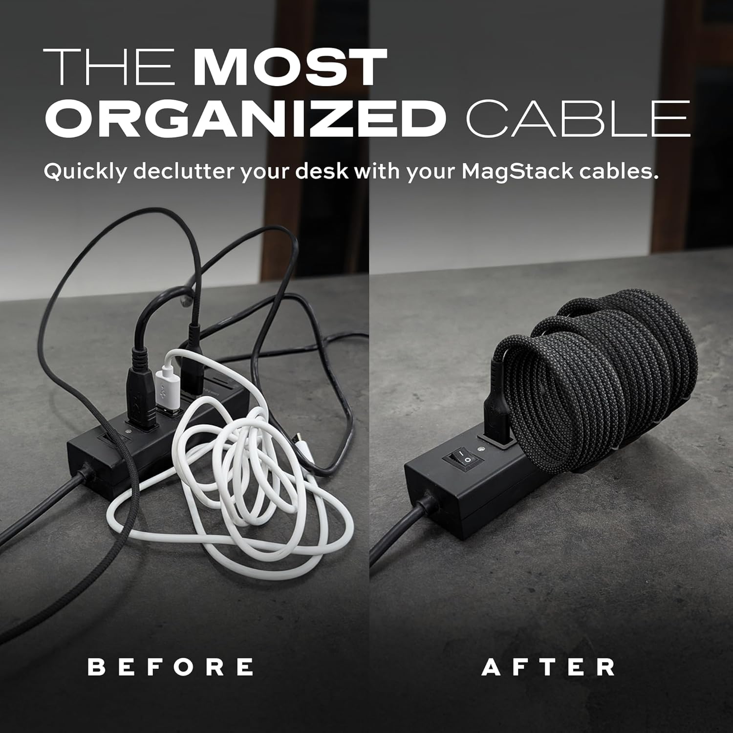 Efficient Magnetic Cable Organization: Say goodbye to cable chaos! MagStack magnetic phone charger iPhone offers a sleek solution to keep your cords tidy. Its iPhone magnetic charger cable self-organizing capability allows you to fold and tidy the cable instantly, making it a super convenient to carry phone charger magnetic.