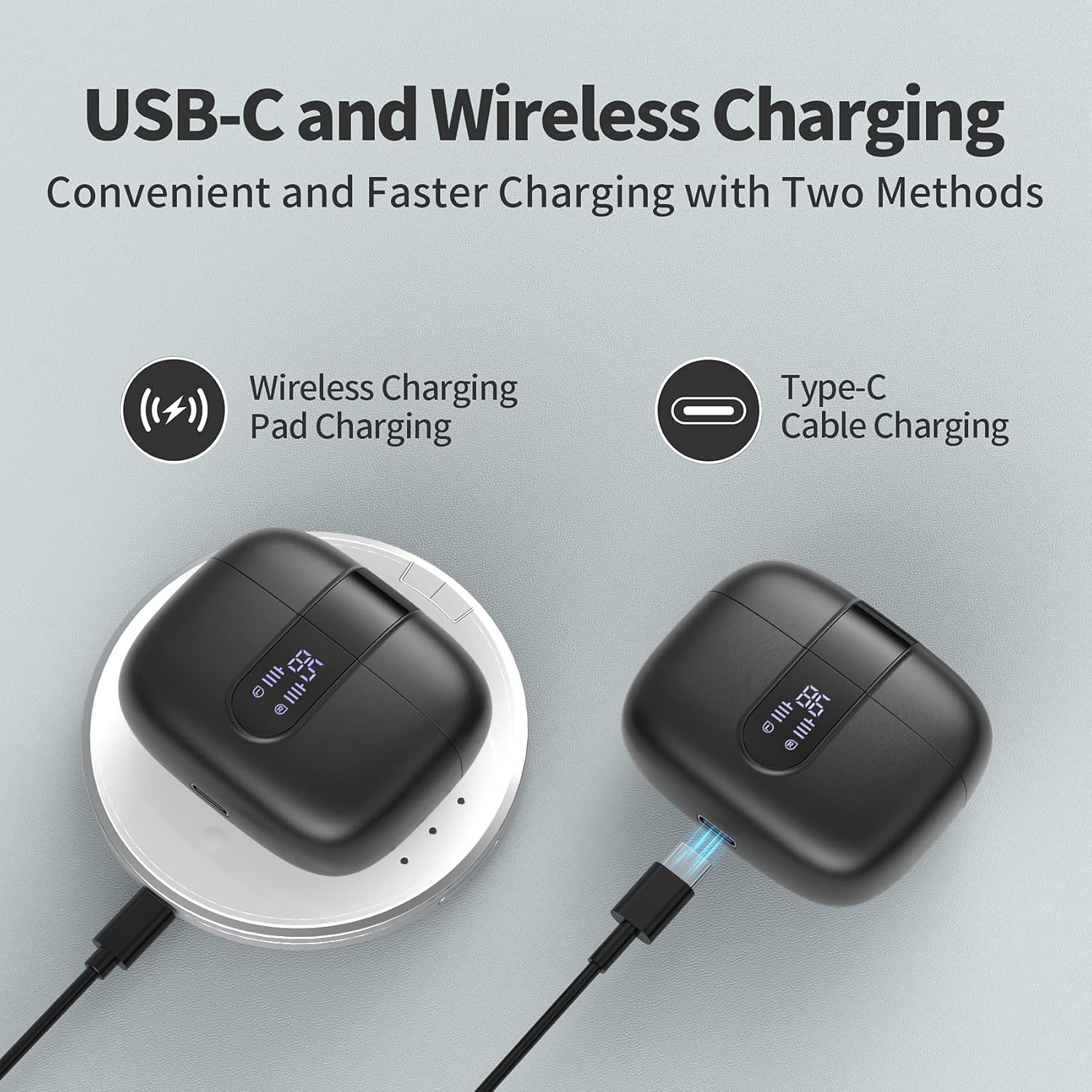 Wireless Charging Case and Portable:Convenience meets portability with our wireless charging case. Simply place the case on a wireless charger to power up case without the need for cables. The compact and portable design makes it easy to carry your earbuds wherever you go, ensuring they are always ready for use. The case provides additional charges, extending the battery life even further and ensuring your earbuds are always ready for action. Enjoy the freedom of wireless charging.