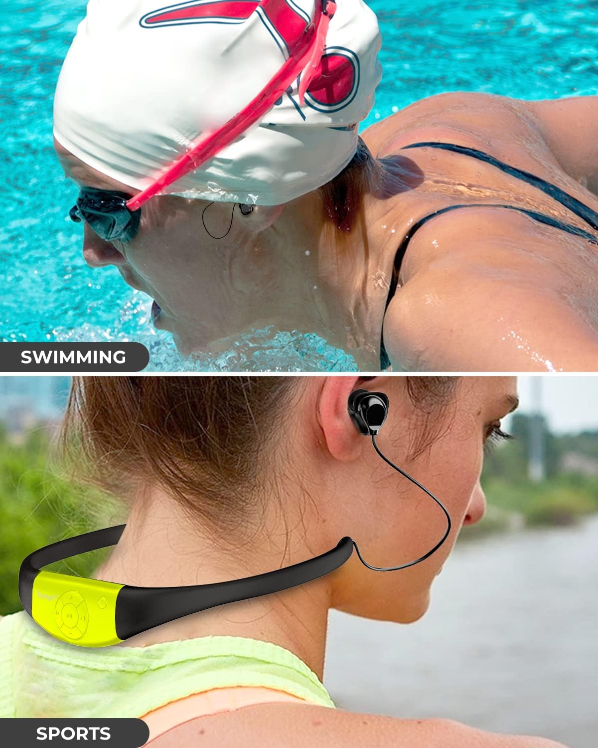 【Fully Silicone-Coated & Versatile Wearing Options】Enjoy the ultimate in comfort and versatility with the Tayogo waterproof MP3 player. Its fully silicone-coated frame allows for comfortable wearing around your neck, while the extended headphone cord provides greater flexibility in how you wear it – either around your neck or over your head. When worn over your head, it’s compatible with swim caps and goggles, making it the perfect accessory for your water workouts.