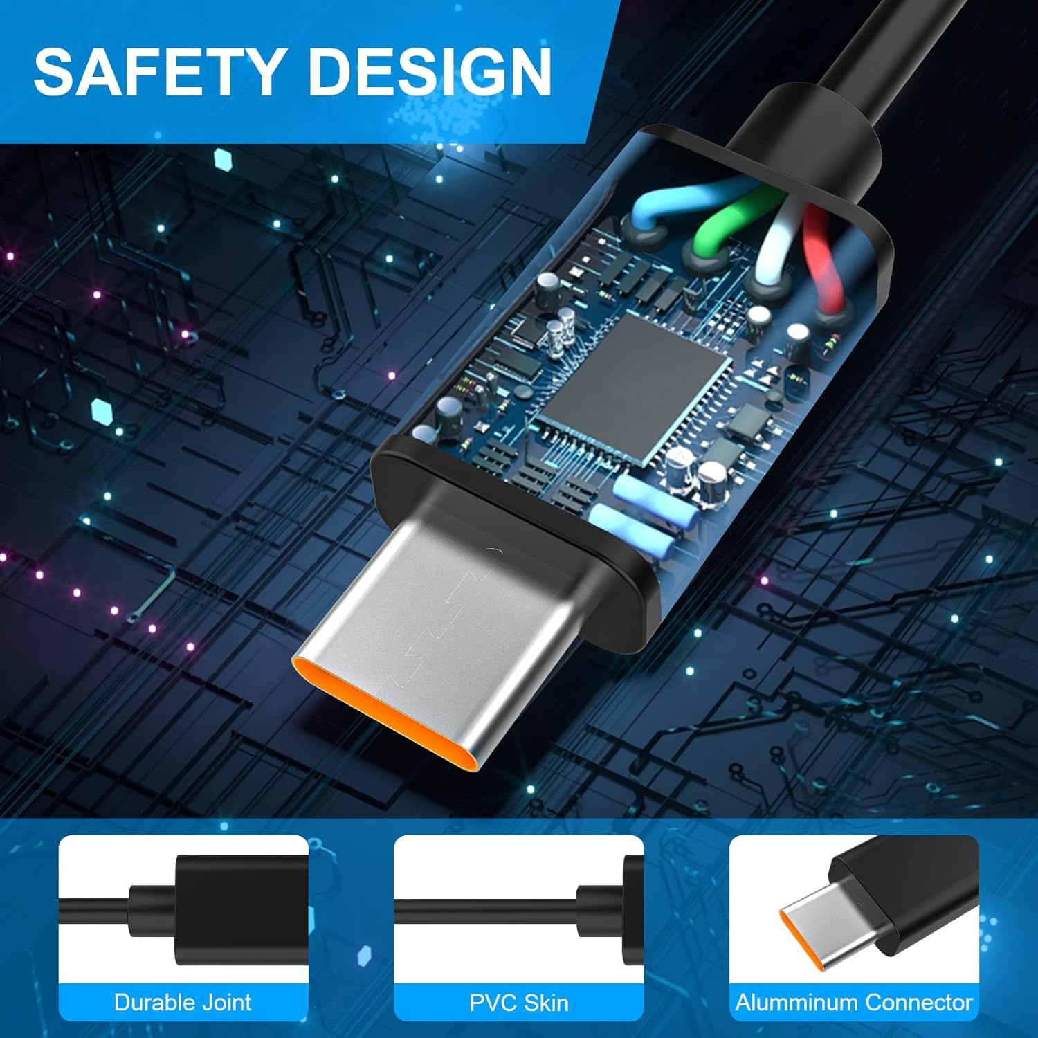 High quality PVC material, can bear 10,000+ bending test, protect the most vulnerable joint of the type c usb cable, Premium Aluminum housing adds the durability of the cable.