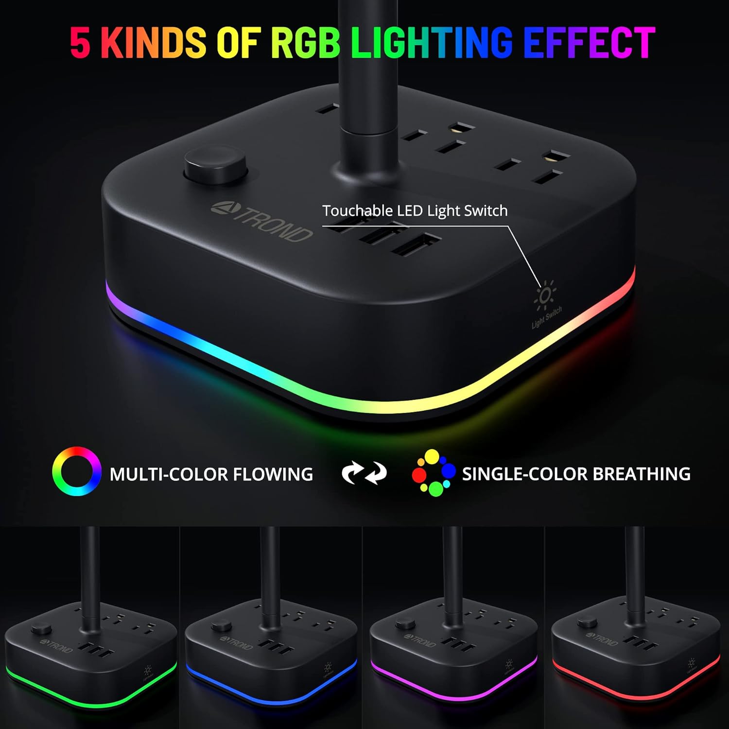 TROND Headphone Stand with USB Charger, Desk Gaming Headset Holder with 3 USB Charging Ports and 3 AC Outlets, RGB Headphone Hanger with 5 Light Modes, for Desk Accessories, Gamer Gifts