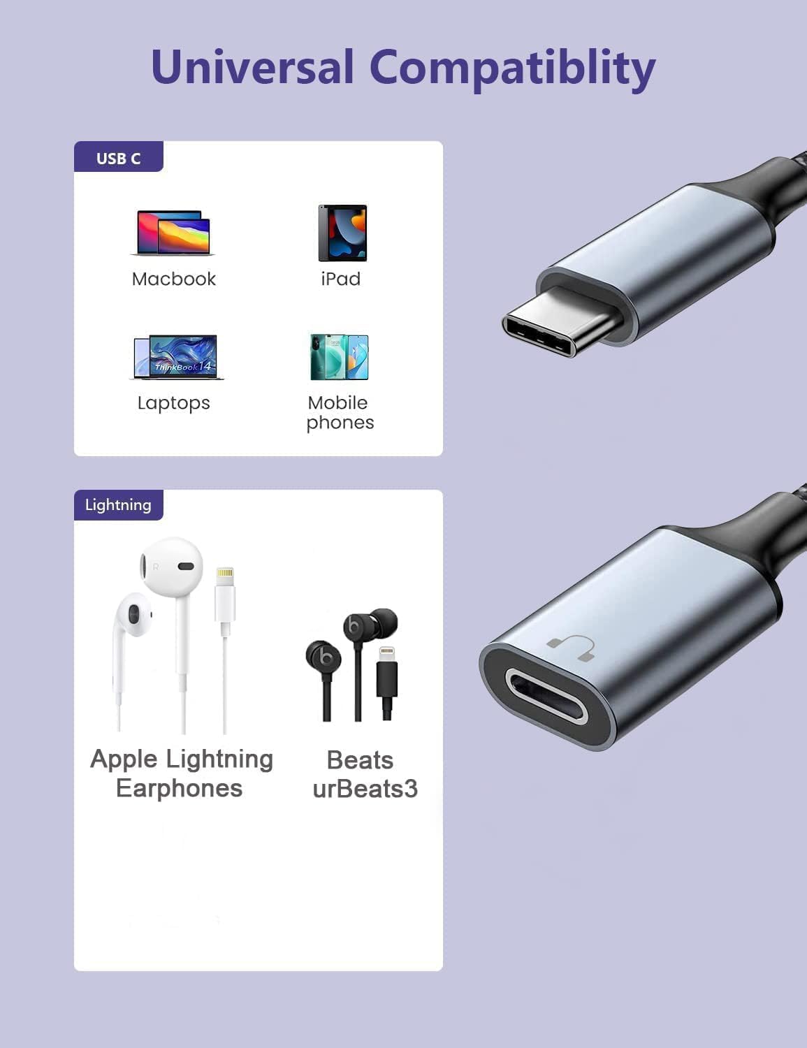 Plug and Play: There is no need for driver installation, just plug your lightning headphones with usb c device by our lightning audio adapter, and you can enjoy the music or make a call freely. Note: audio only, not support charge; No data transfer; not for Apple Pencil charge