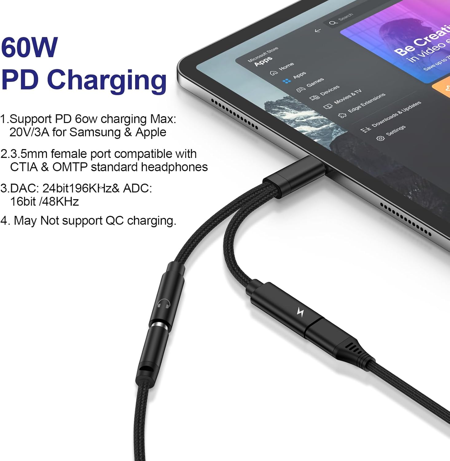 60W Super Fast Charging: USB c splitter audio and charging adapter support up to 60W PD 3.0 Super Fast Charging, you can feel free to listen to your music or playing games while charging. NOTE: May not support QC for some new phones. Suggest using type usb c wall charger to get fast charging.