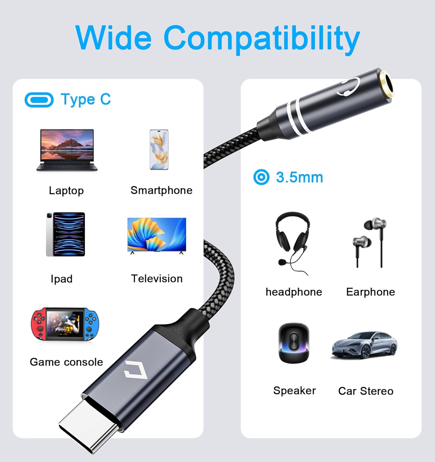 【 Wide Compatibility 】 Adopted advanced chips, wider compatibility than others type c to 3.5mm adapters, compatible with most of the type c tablet and smartphones: iPhone 15/ Pro Max/ Pro/ Plus, iPad pro, iPad Air, iPad mini 6, Mac book; Samsung Galaxy S23/ S22/ S21/ S20, S10/ S9/ S8, Note 20/ 10/9/ 8; Google pixel 4/ 3/ 2; One plus 6/ 7; Huawei Mate/ P; HTC; LG and more